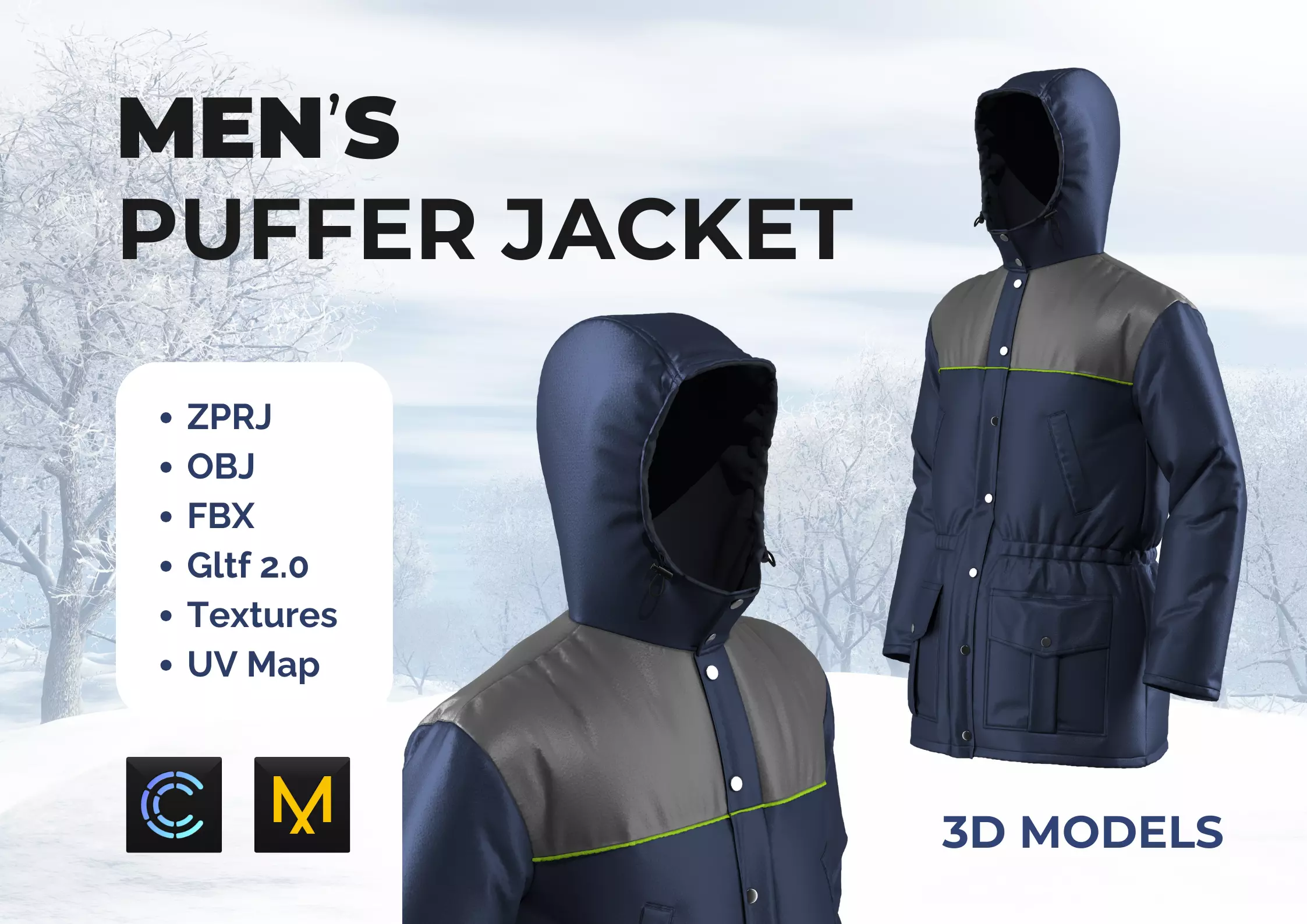 Men's puffer (padded) jacket with pockets and hood. Created in CLO3D ver.7.2. High detailing of products.