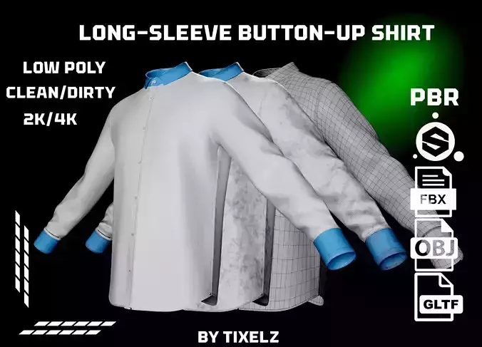Men’s Long-Sleeve Button-Up Shirt | Contrast Collar & Cuffs | Clean & Dirty Versions | 2K & 4K PBR Textures