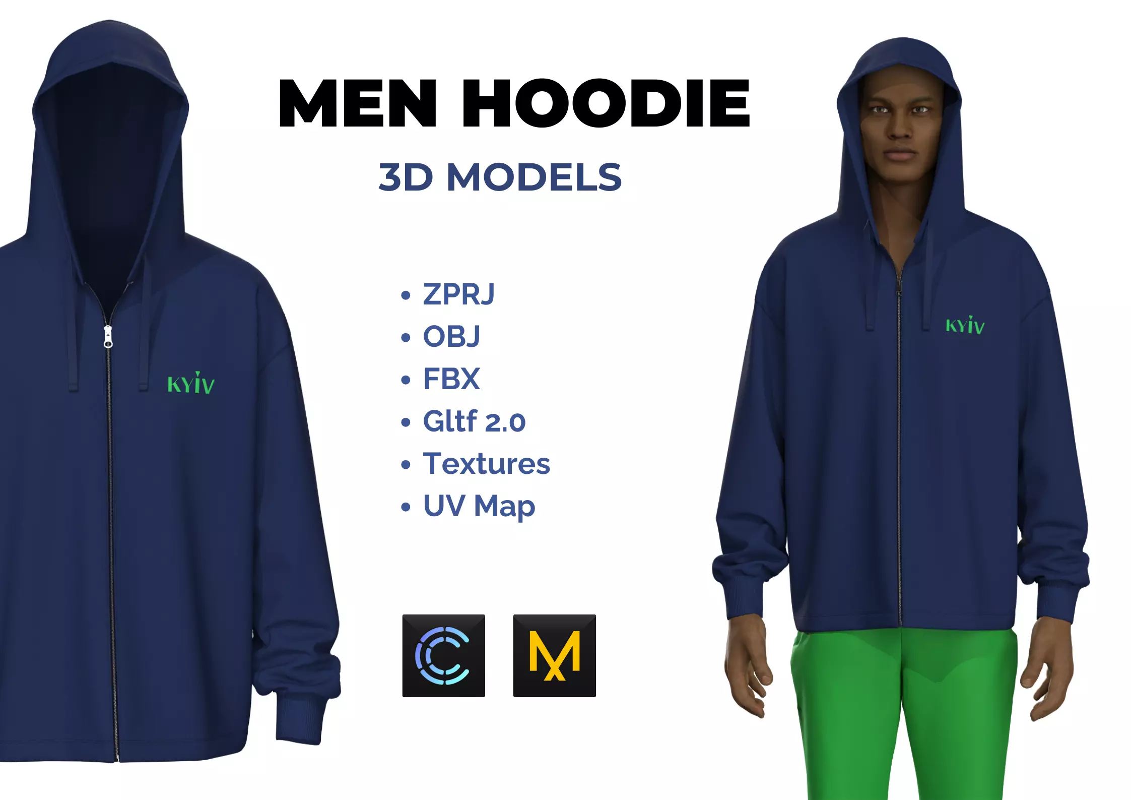 Men Zipper Hoodie with embroidery. Created in CLO3D ver.7.2. High detailing of products.