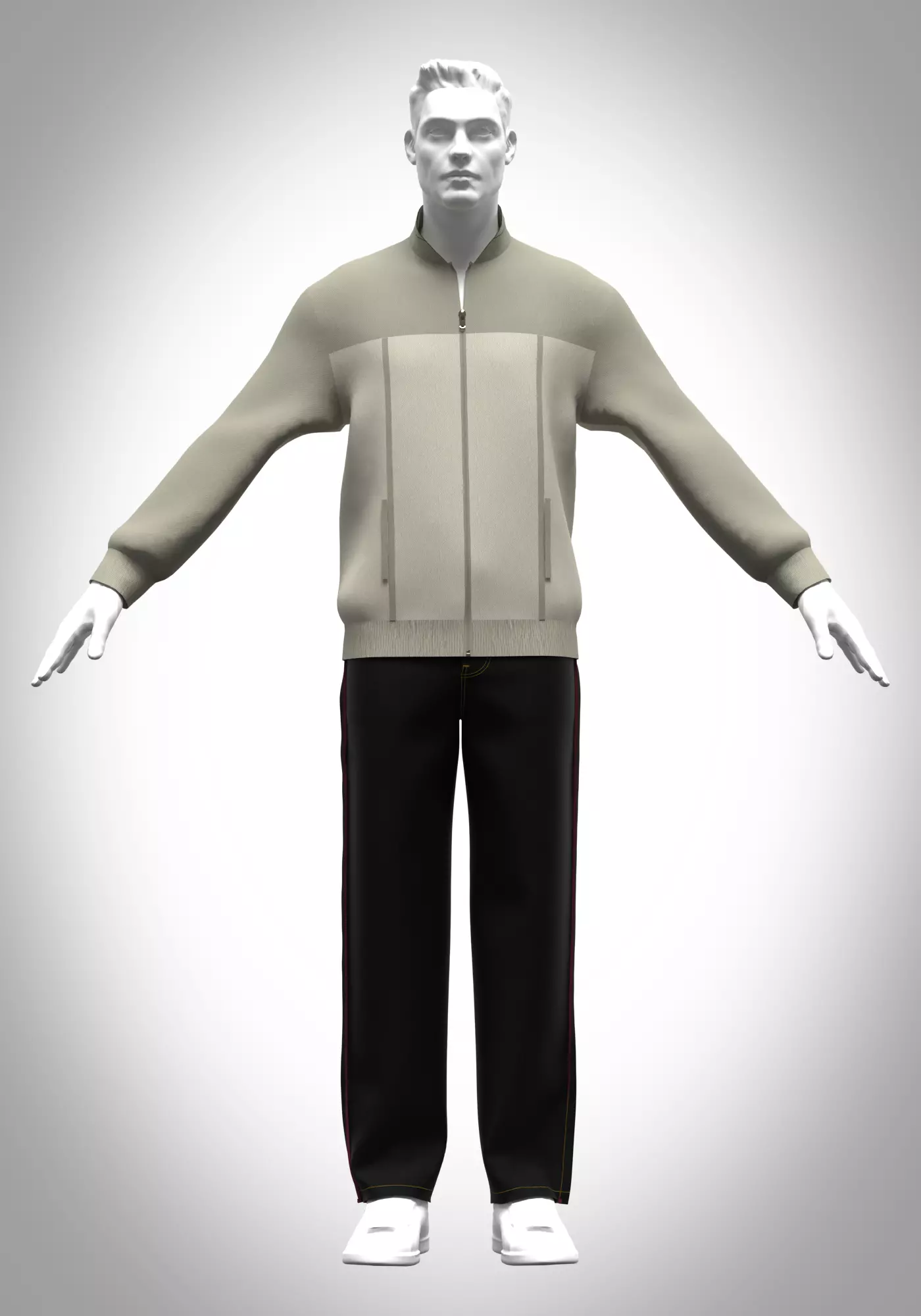 This high-quality 3D model features a mens bomber jacket and five pocket pant (Rigged model) fashion outfit designed using Clo3D with a rigged model, perfect for digital fashion showcases, rendering, animation, gaming, or virtual fitting. Outfit Includes: Top: A bold, asymmetrical color-blocked t-shirt featuring black and teal panels with a subtle draped neckline and a unique overlapping V-cut back detail for added dimension. Pants: Dark navy wide-leg trousers with inserted flared panels of abstract multicolor print at the hem, adding flair and contrast to the clean silhouette.Features: Clean topology and accurate garment simulation. Realistic fabric drape and textures. Ready for rigging, animation, or rendering. Includes front, side, and back views.