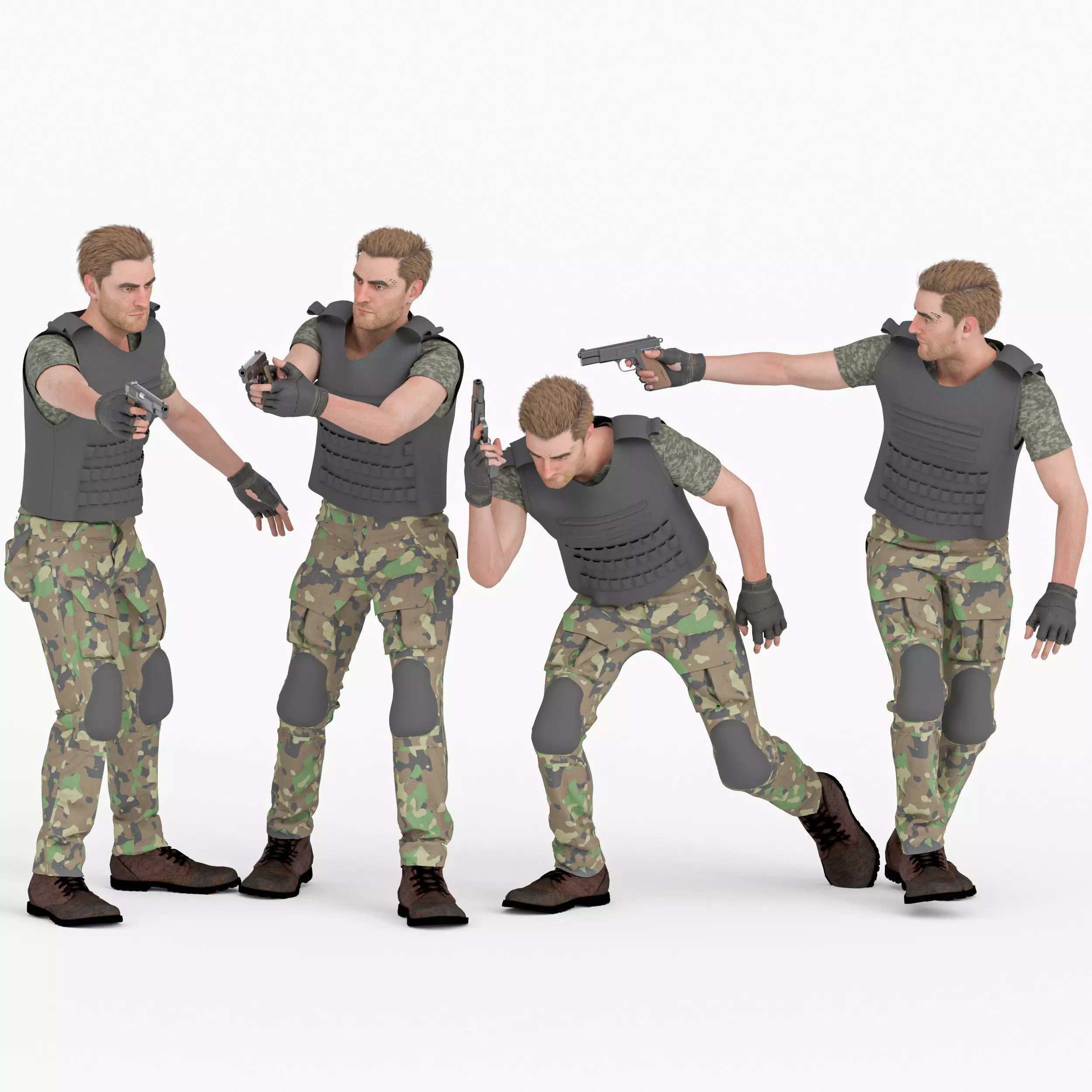 Texturing & Materials:The model boasts stunning, photorealistic PBR (Physically Based Rendering) textures created in Substance 3D Painter. Materials accurately represent realistic skin tones, detailed hair, and various rugged fabric textures for military clothing (e.g., ripstop, nylon), as well as textures for metal hardware, plastic components of gear, and worn elements. These high-resolution textures ensure the character looks battle-hardened and responds beautifully to diverse lighting environments.