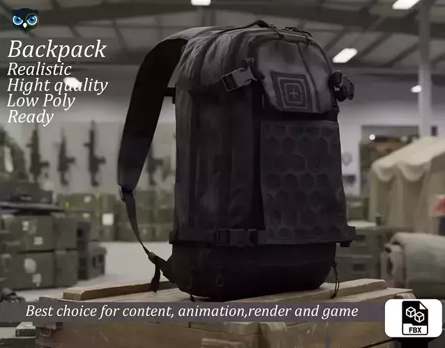 Add functional realism to your character's loadout with this detailed Tactical Backpack. Modeled after modern multi-mission packs (similar to the 5.11 AMP series), this asset features a distinctive hexagonal attachment grid (HEXGRID) on the front panel, setting it apart from standard horizontal MOLLE bags.