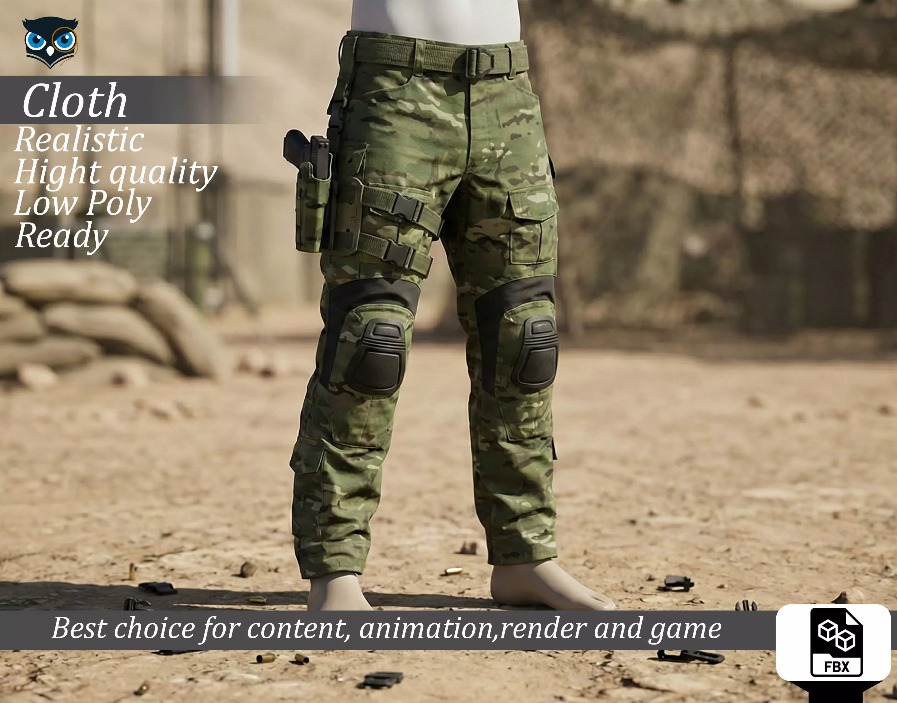 Create a complete special forces character with this high-quality 3D model of modern tactical combat pants. This asset is designed with a realistic MultiCam-style camouflage pattern and features integrated hard-shell knee pads, a heavy-duty rigger's belt, and a detailed drop-leg holster equipped with a sidearm (pistol) and magazine pouches.