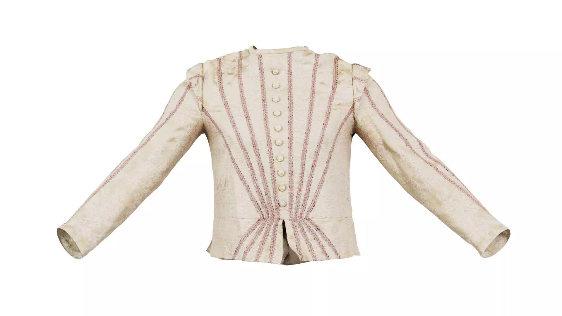 3D scanned model featuring a white jacket with pink stripes on it. This model, nature jacket, has been created using photogrammetry from a real world object.The raw scan data has been cleaned, retopologized and UV-unwrapped using Zbrush. The result is a low poly mesh with baked maps. The .obj and .mtl are configured so that maps will load automatically in the shader (tested in Blender). In addition, a Blender scene is provided with the model and shader already set up for rendering and export. Detailed information below: