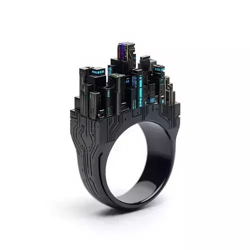 The Overall Concept This isn't a traditional piece of jewelry; it is a wearable piece of architecture. Instead of holding a gemstone, this ring features a miniature, high-tech city skyline sitting on top of the finger. It fits perfectly into a cyberpunk setting or a sci-fi inventory.