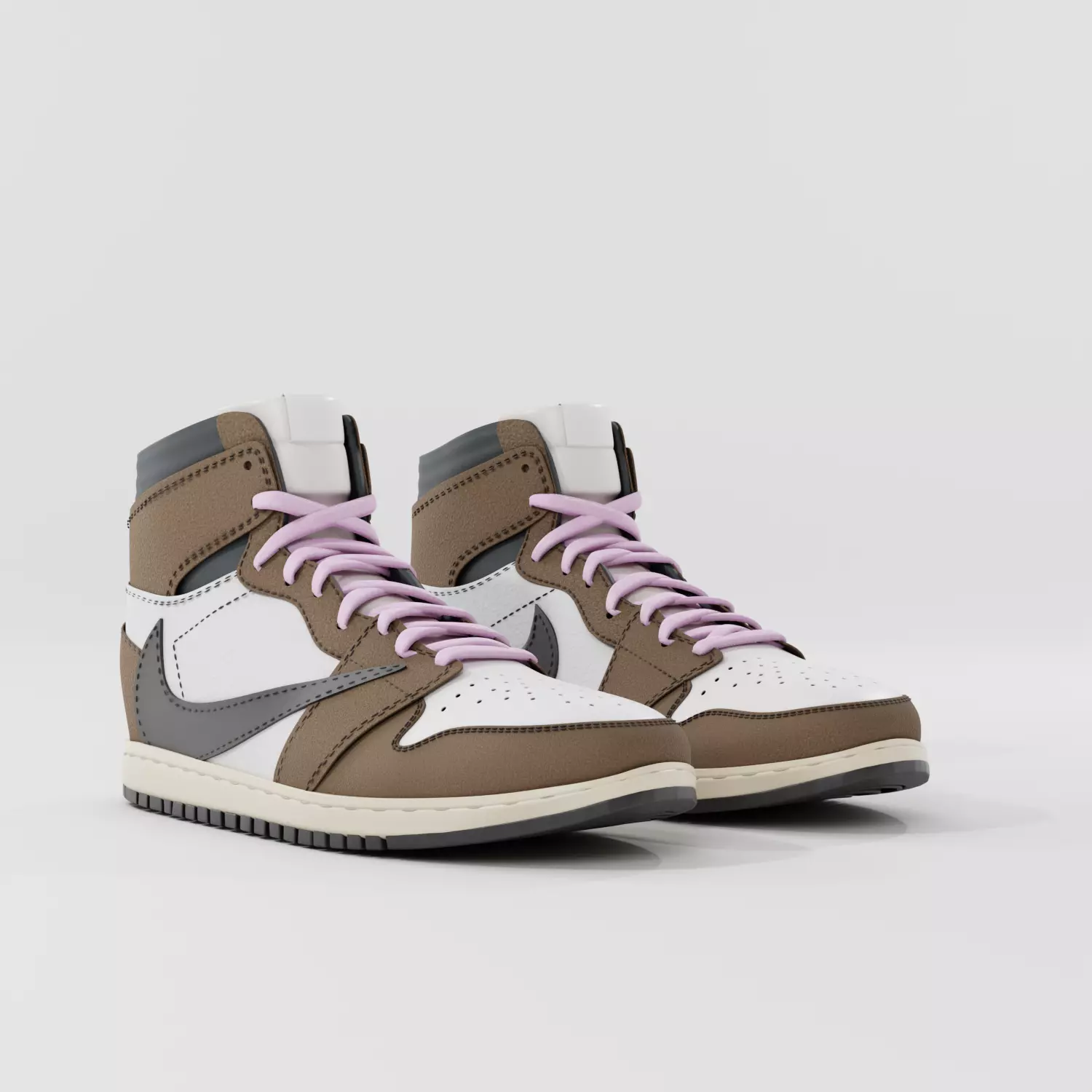 Model of the iconic Jordan 1 in the Travis Scott edition. Carefully textured. All parts and color values are easy to manipulate through color nodes or similar.If any othe files are needed feel free to ask and I´ll see what I can do.