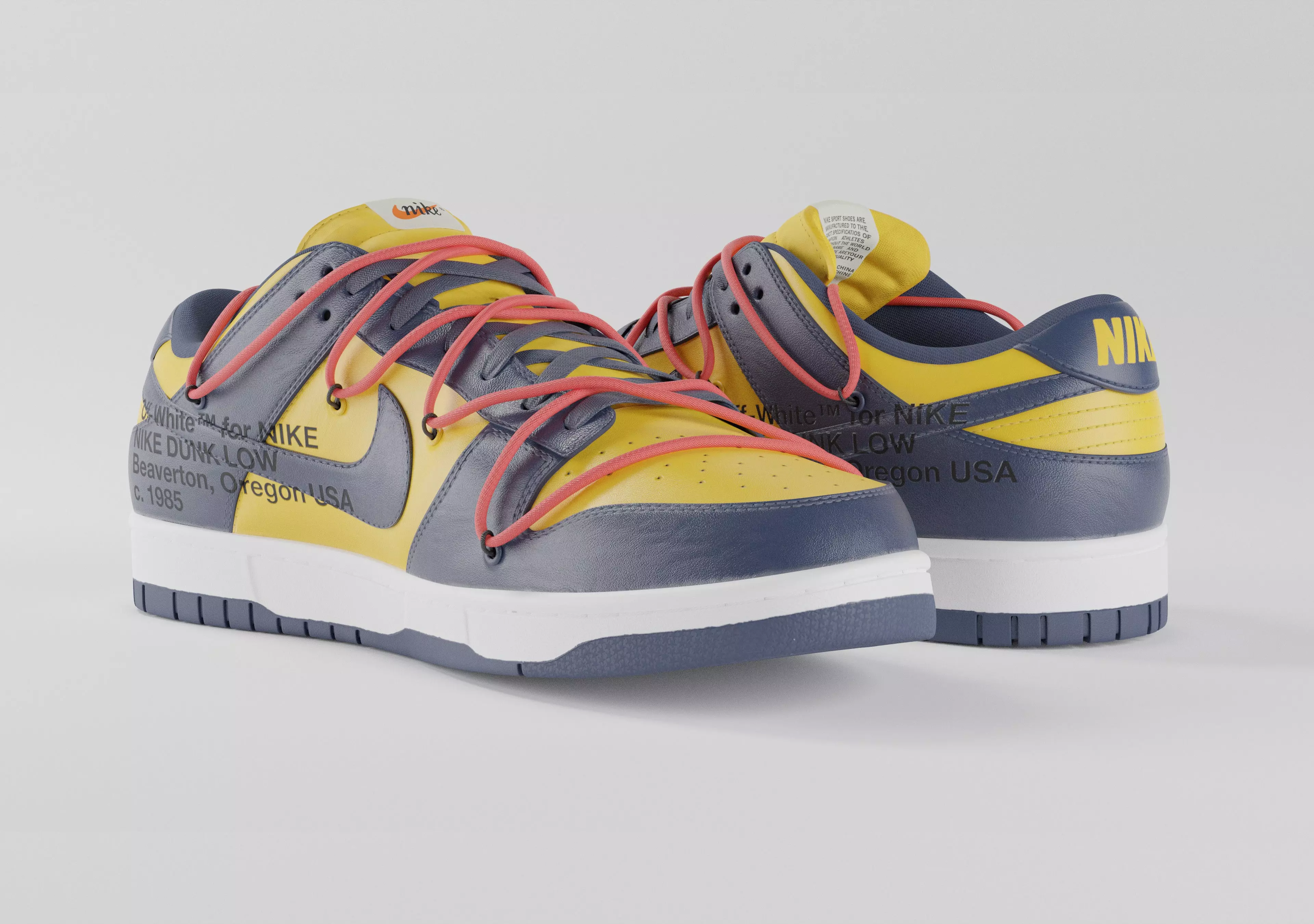 Off White collaboration with Nike on a Dunk low in Michigan Blue, made in Blender, textured in Substance. Virgil Ablohs take on the Nike Dunk first debuted in 2019, A reimagined tongue coupled with bright, Flywire lacing helped this shoe to stand out and cement its place in the storied legacy of the Nike Dunk. This colourway boasts navy leather accented by a smooth yellow leather.