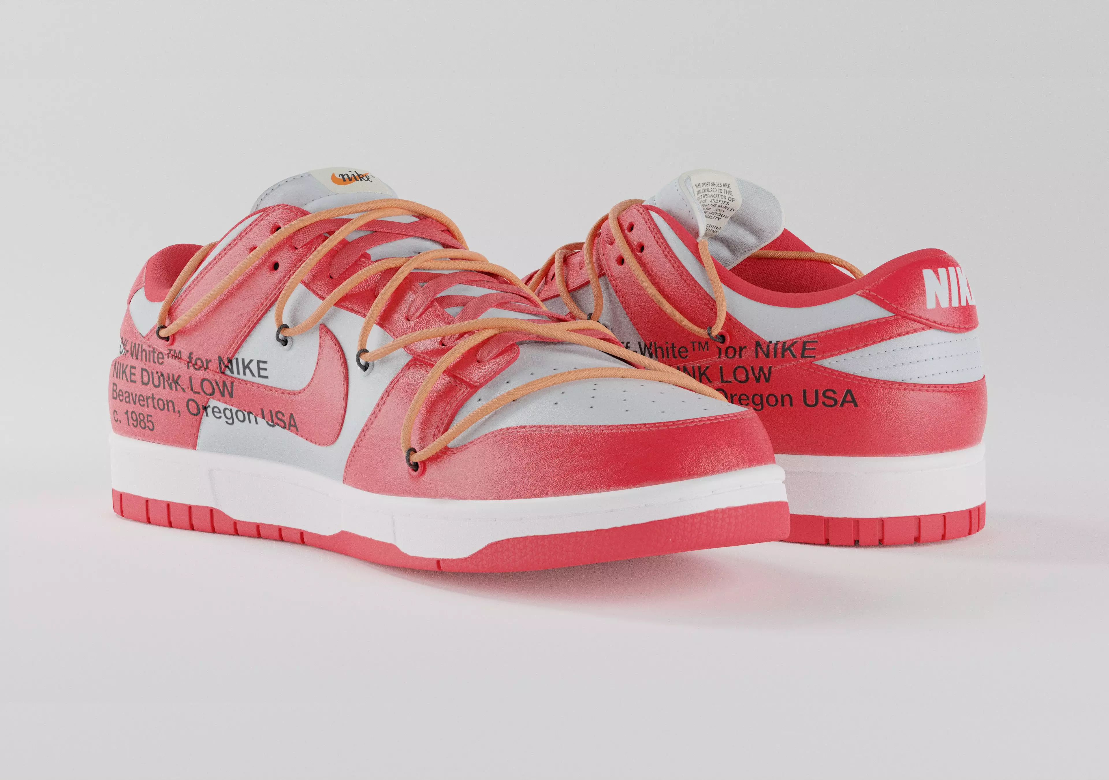 Off White collaboration with Nike on a Dunk low in University Red, made in Blender, textured in Substance. Virgil Ablohs take on the Nike Dunk first debuted in 2019, A reimagined tongue coupled with bright, Flywire lacing helped this shoe to stand out and cement its place in the storied legacy of the Nike Dunk. This colourway boasts red leather accented by a smooth grey leather.