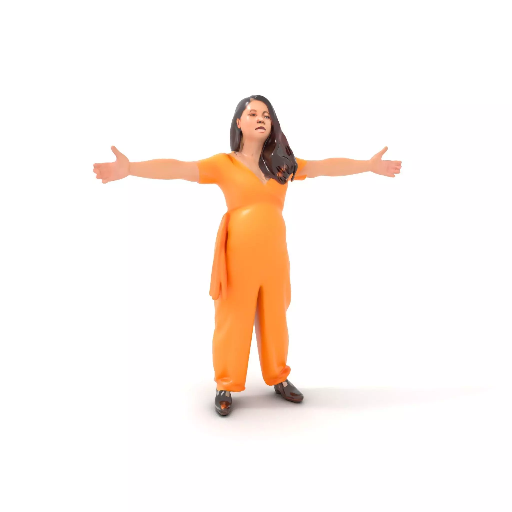 This 3D model features a striking orange maternity outfit designed for modern virtual design applications. It includes a wrap-style top with flowing fabric, suitable for realistic character design or illustrative art projects.