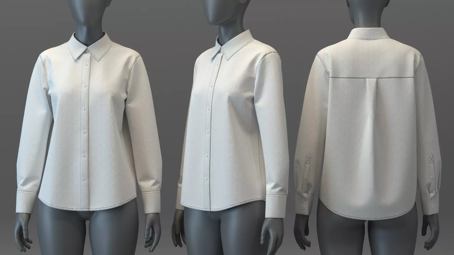 DESIGN DETAILS• Fabric: Linen (VMOD Library)• 8 button closure (functional)• Silhouette: Baggy fit• Sleeve: Long; Extended cuff with 2 button closure• Curved Hi-low hemline• Includes facing and stitches for a more realistic look when rendered