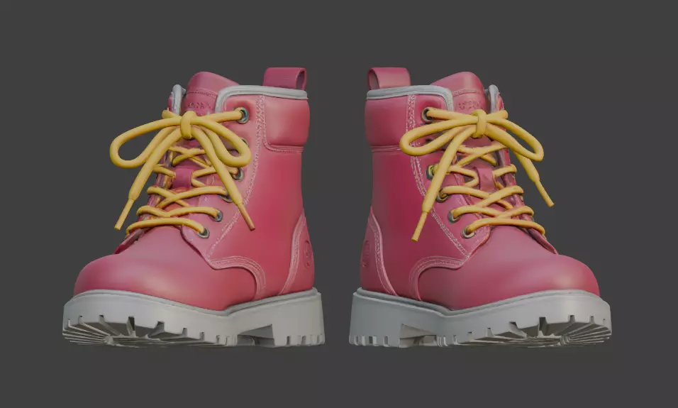 This is a high-quality 3D model of a pair of pink combat boots. It has a bright pink leather look with yellow laces and a strong grey sole. The model is detailed and good for close-up renders, games, VR/AR, character clothing, fashion designs, or 3D printing. It comes ready to use in your projects. Perfect for adding a fun, stylish, or bold touch to female or unisex characters.