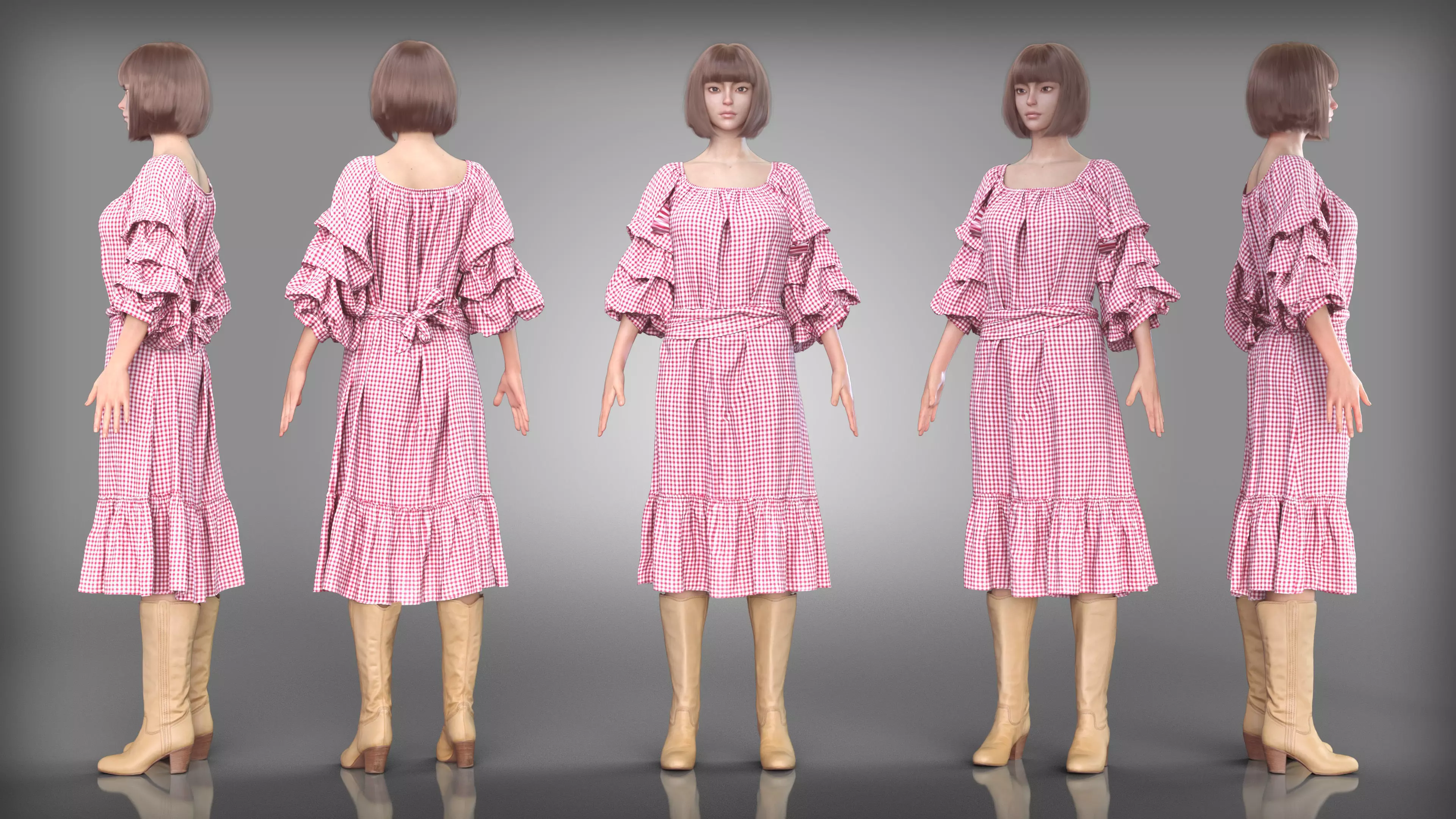 Pink Gingham Dress with Ruffled Sleeves Tan Knee High Boots Low-poly 3D model