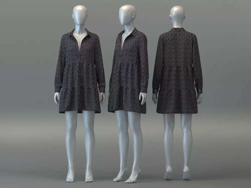 DESIGN DETAILS• Main Fabric: Challis Polka Dot (VMOD Library)• Neckline: Shirt collar with Open placket (V-neck)• Sleeves: Long; Semi-balloon sleeve with cuffs & button closure• Body: Relaxed• Cut & sew tiered skirt• Finish: Taping, puckering & stitches included for a more realistic look when rendered
