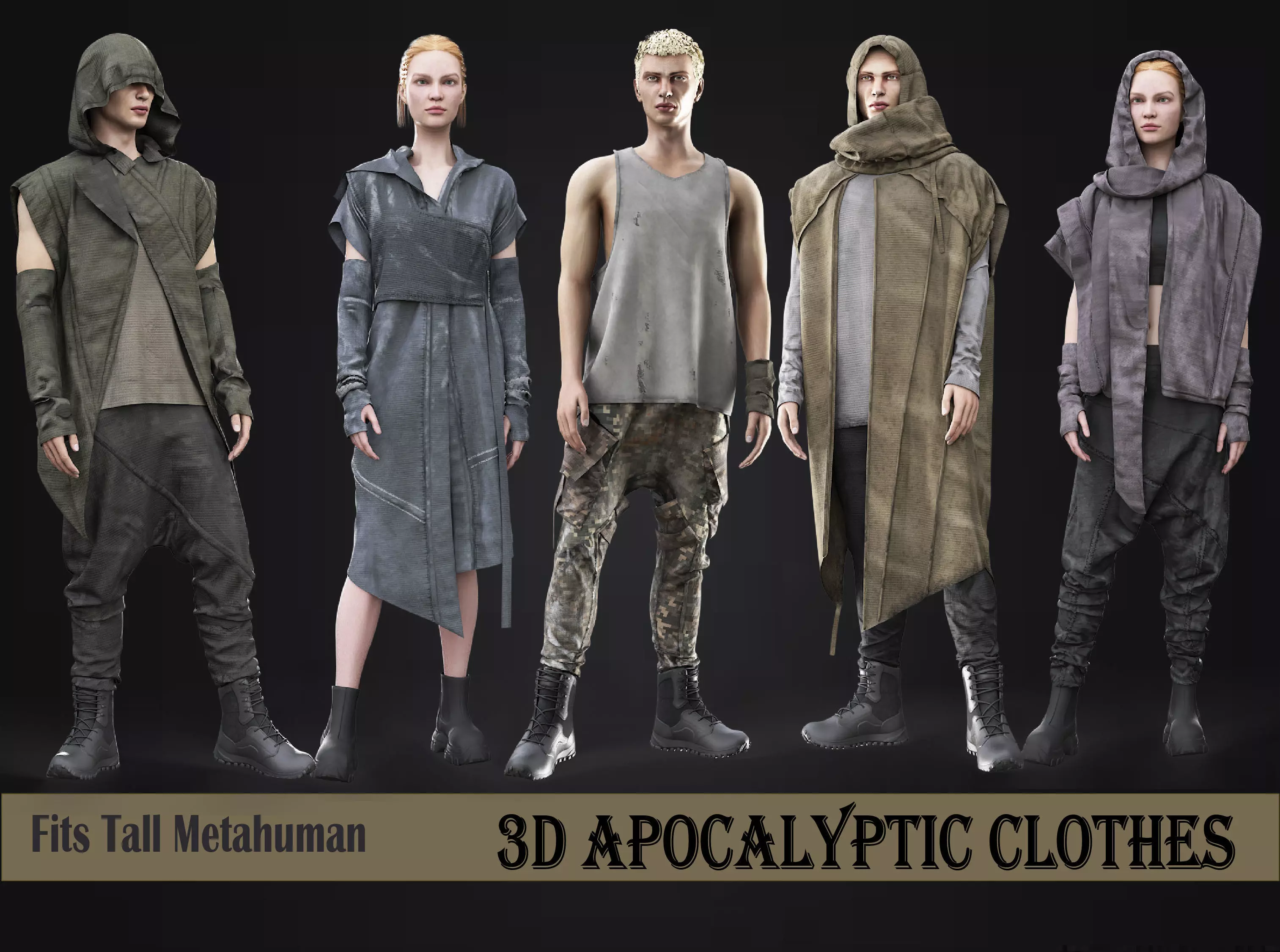 This collection includes 5 different outfits. 2 outfits are for METAHUMAN TALL FEMALE and 3 of there are for METAHUMAN TALL MALE. Each Zip file includes: