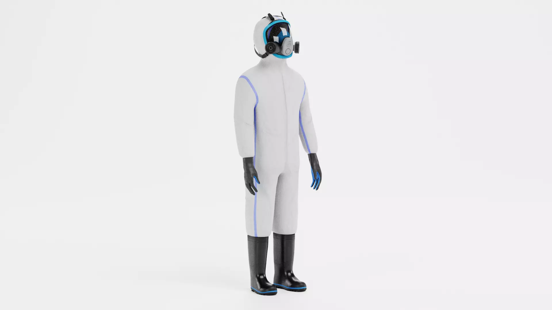 A realistic protective hazmat suit in a clean white finish with subtle blue accents, designed for controlled environments and professional safety scenarios. The model includes a full set of protective elements, including gloves, rubber boots, and a detailed gas mask with filtration system. The balanced color scheme supports a more clinical and structured look. This makes the asset well suited for laboratory, medical, and industrial scenes.