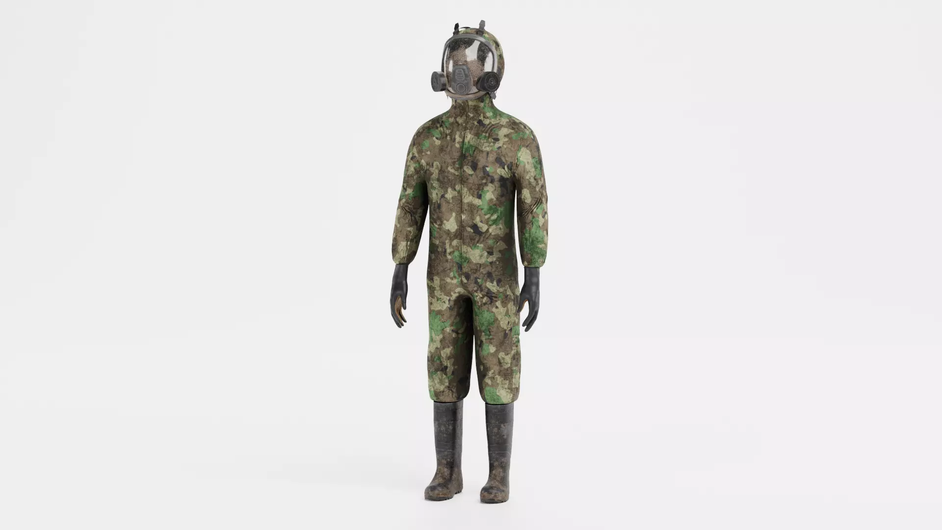 A realistic protective suit with a camouflage pattern, presented with visible dirt and surface wear that reflects active use in demanding environments. The suit includes a full set of protective gear, with gloves, rubber boots, and a detailed full-face gas mask with filtration units. Dirt buildup is distributed across the surface in a natural way, adding variation while keeping the overall structure clear and readable. This makes the asset suitable for scenes where equipment is expected to show real-world use, from industrial work to emergency and field scenarios.
