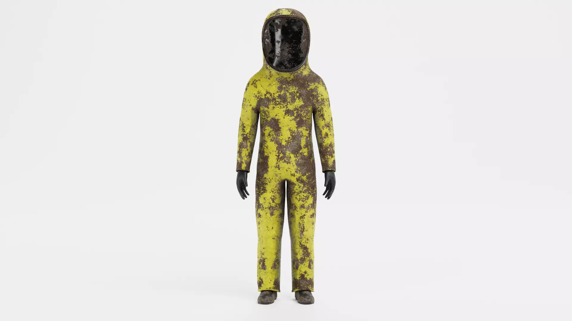 A realistic fully enclosed protective suit in yellow, presented with heavy dirt and mud buildup that emphasizes extended field use. The integrated face shield and continuous suit structure create a strong, unified form. Dirt accumulation is distributed across the suit, reinforcing a sense of exposure and environment. This makes the asset effective in scenes where visual storytelling relies on clear signs of use and demanding conditions.