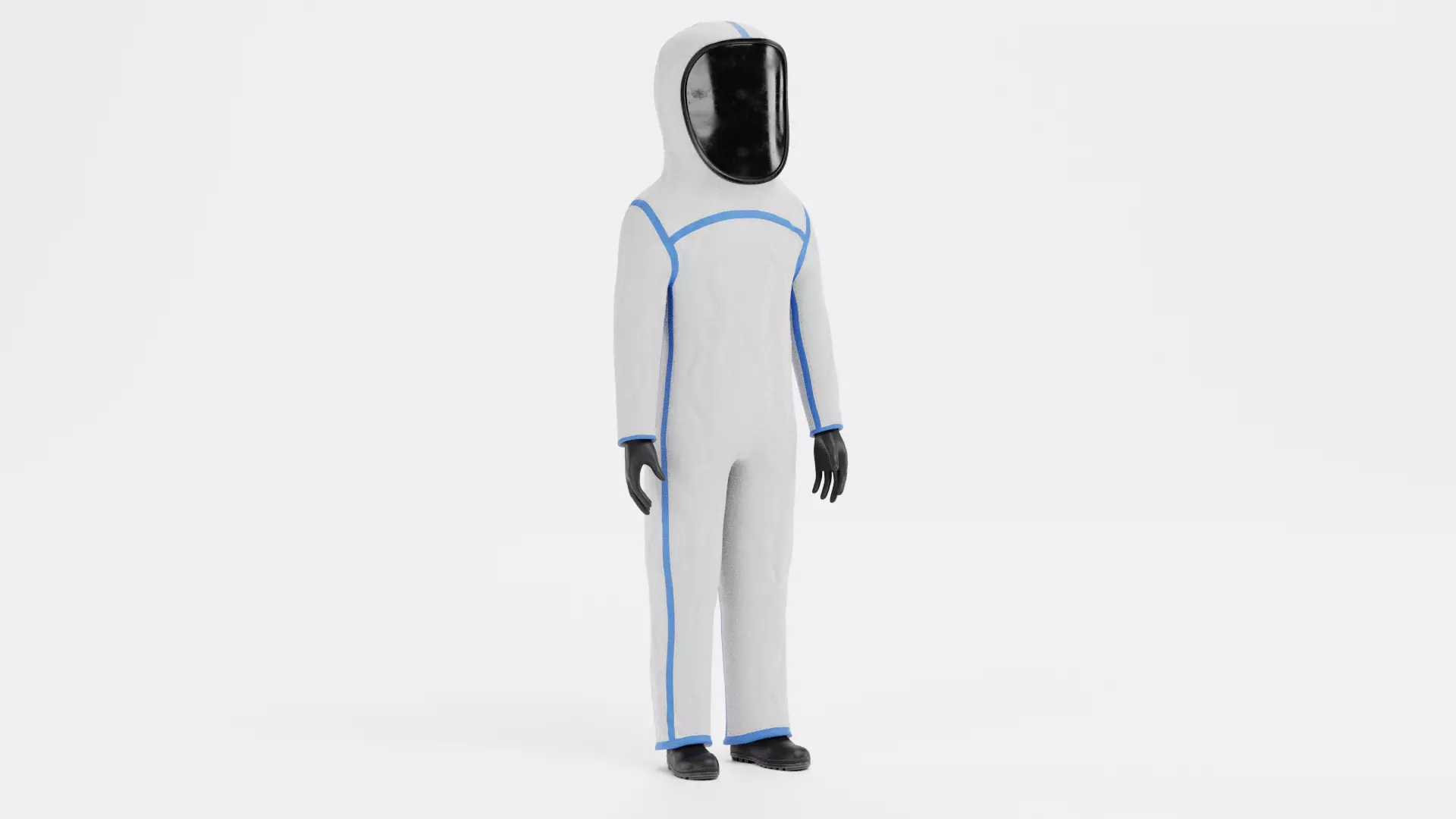 A realistic fully enclosed protective suit designed for high-level hazard scenarios, featuring an integrated face shield as part of the suit construction. The continuous surface creates a unified, sealed appearance. The white base with subtle blue detailing and integrated visor support a clean, professional look. The unused material state keeps the surfaces consistent and readable, making the asset suitable for close-up shots and technical environments.