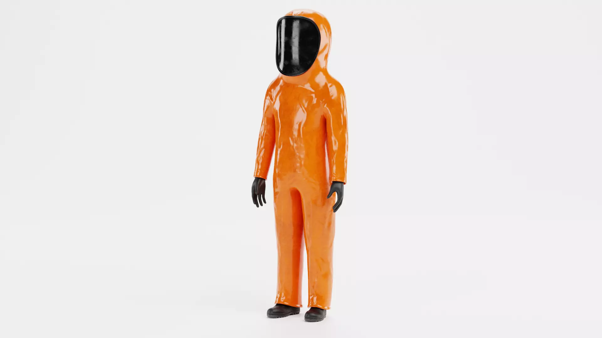 A realistic fully enclosed protective suit designed for high-level hazard scenarios, featuring an integrated face shield as part of the suit construction. The continuous surface creates a unified, sealed appearance. The vivid orange finish and integrated visor support a professional look. The unused material state keeps the surfaces consistent and readable, making the asset suitable for close-up shots and technical environments.