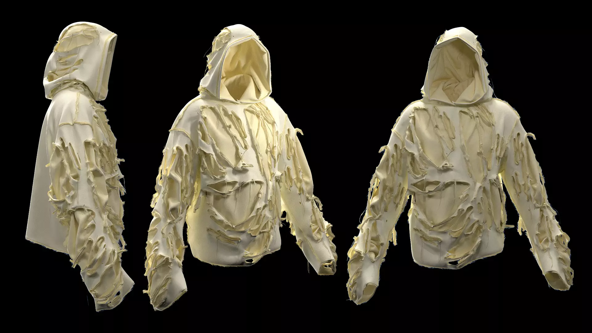 3D garment project created in CLO 3D featuring a distressed layered, ripped holes hoodie with raw edges.