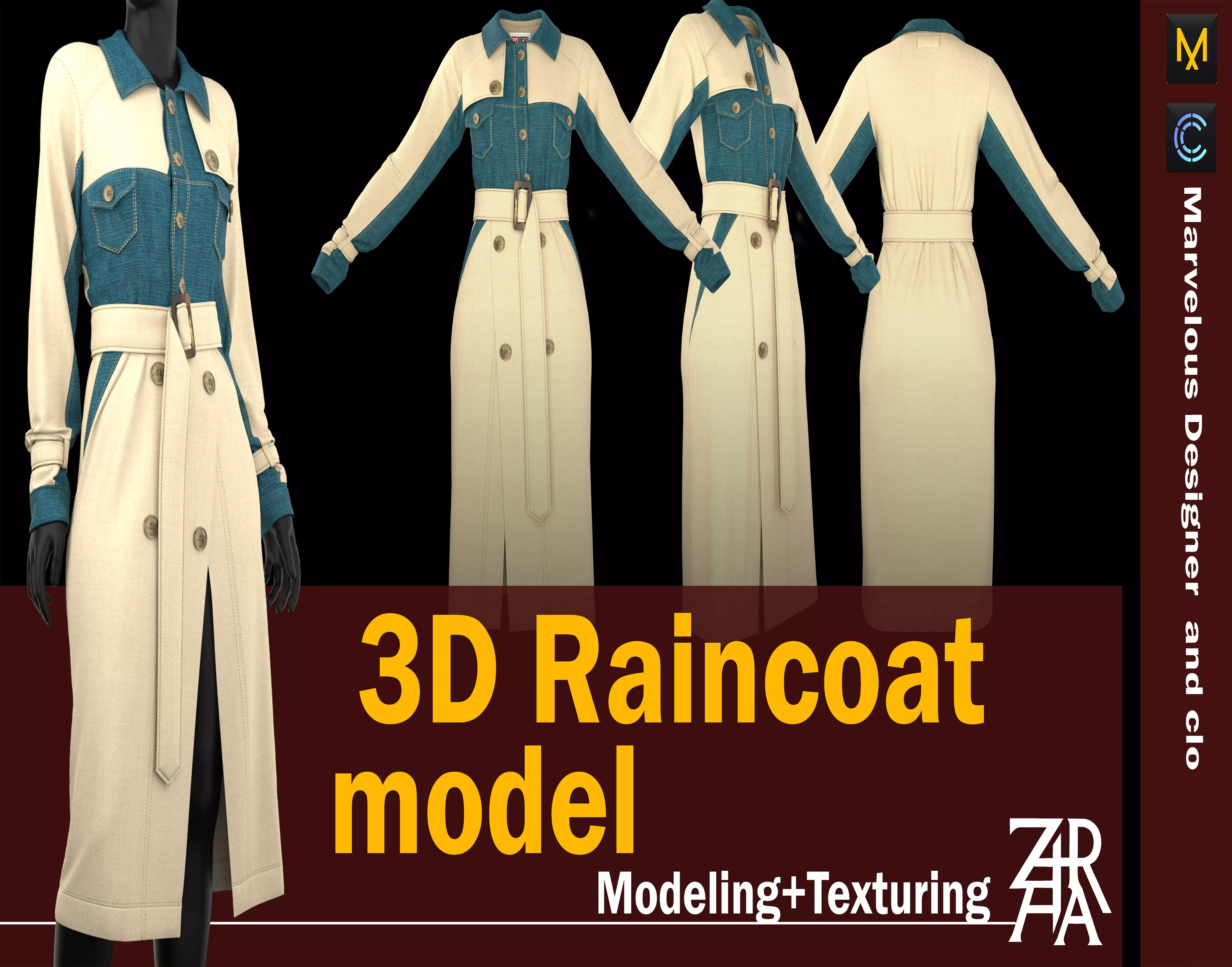 With contrasting denim textures, a belted waist to define the silhouette, and detailed buttonwork, this design is ideal for realistic renderings, fashion visualization, and 3D projects that require a bit of sophistication.