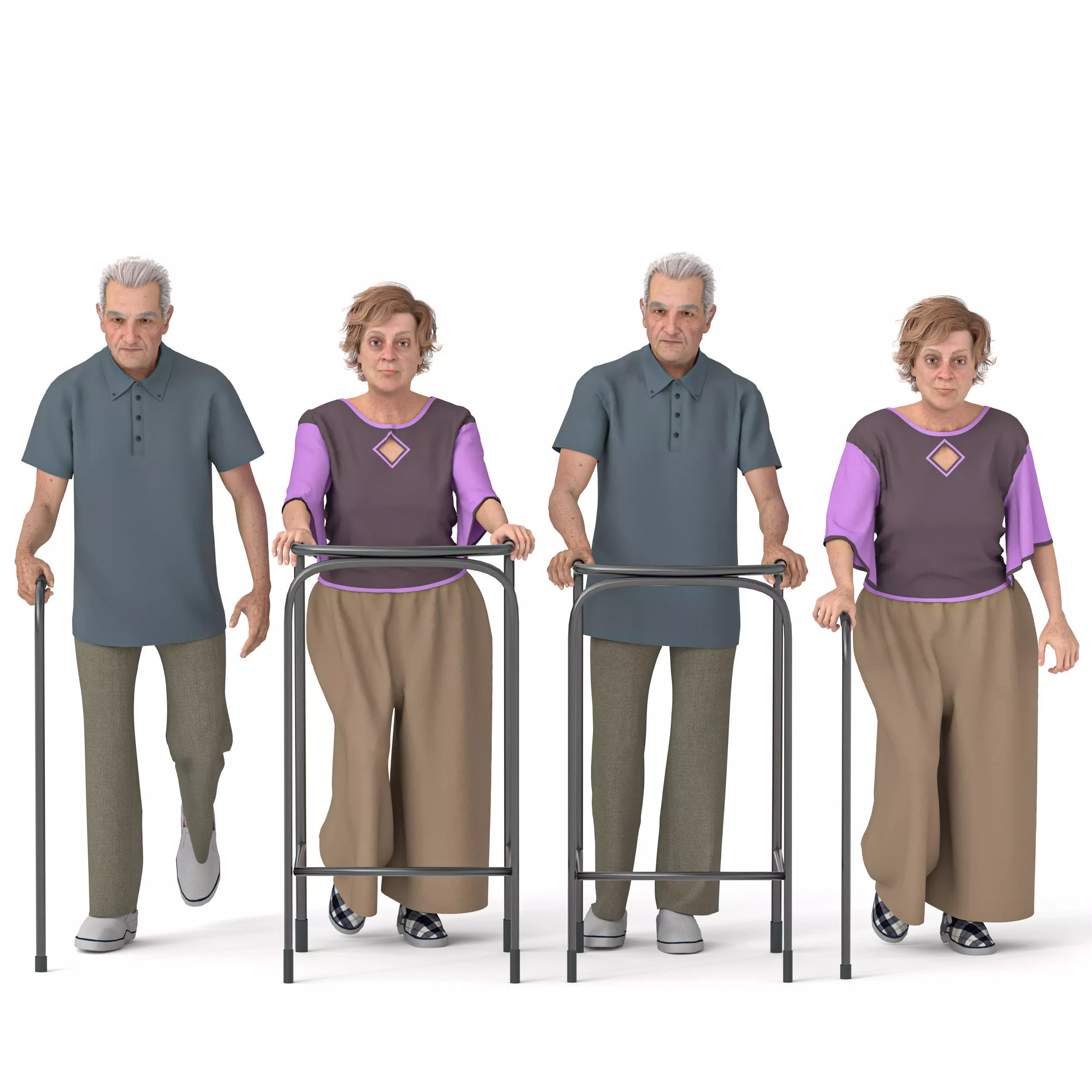 Add a touch of authentic human diversity and realism to your digital scenes with this high-quality 3D model of an elderly woman, thoughtfully accompanied by a detailed walker. Perfect for healthcare visualizations, senior living facility renderings, urban street scenes, architectural walkthroughs, or any project requiring a realistic representation of an older adult with a mobility aid.