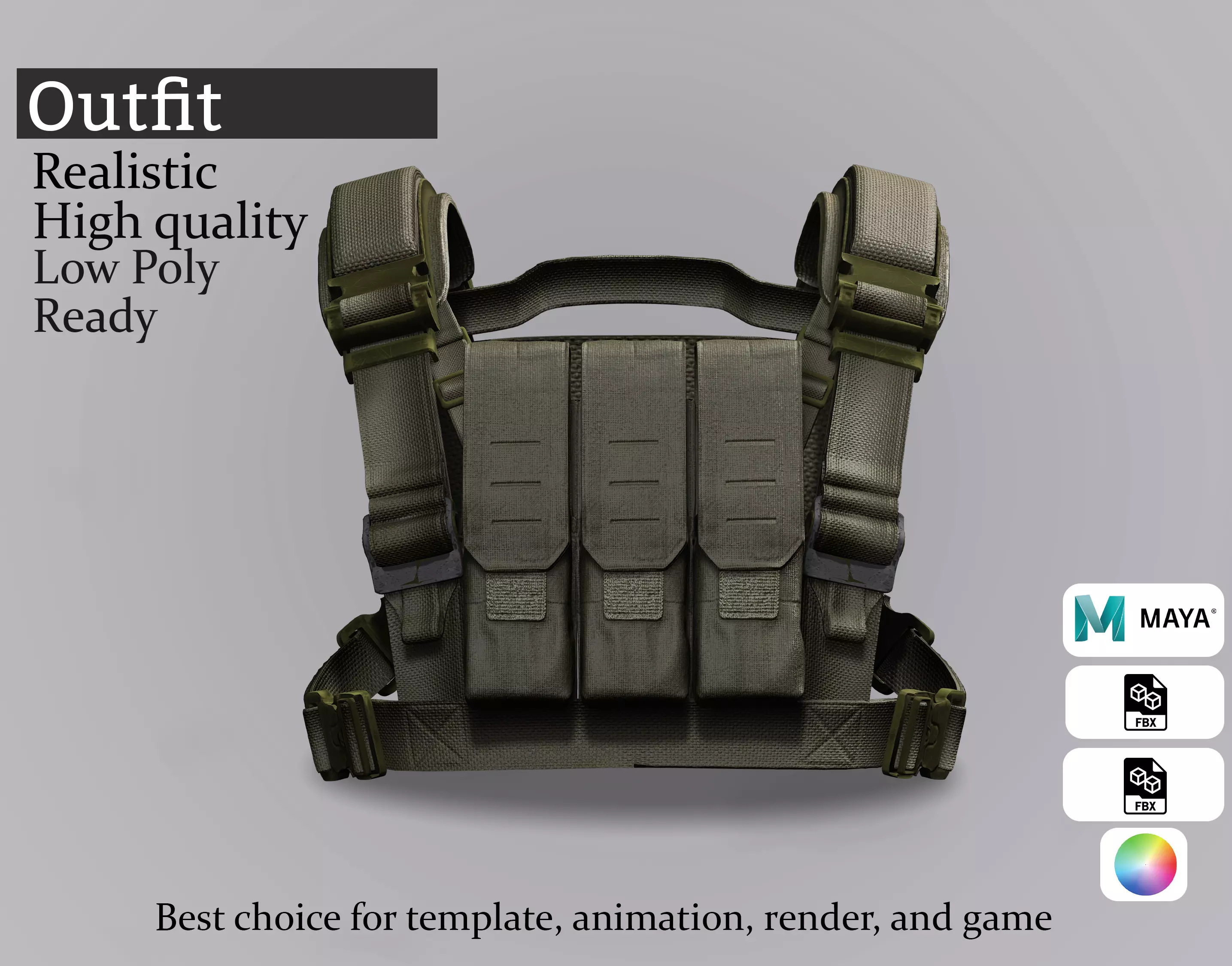 Game-ready military harness rig with detailed textures and optimized topology. Designed to complement any tactical or soldier character. Perfect for FPS, war, or survival games. Includes PBR maps for real-time or cinematic rendering.