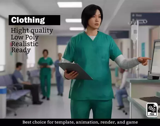 Medical training simulations and VR apps.Hospital scenes in video games.Background characters for architectural visualization.Cinematic short films and animations.
