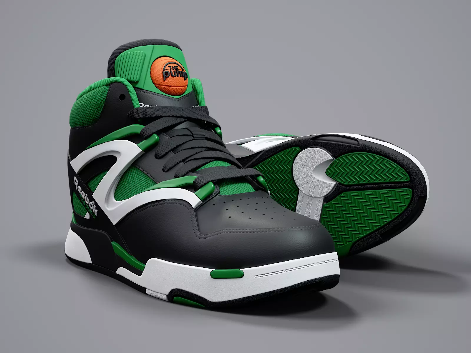 Medium poly PBR textured model of Reebok Pump Omni Zone-2 sneaker (Celtics colorway). Well textured and ready for Virtual Reality (VR), Augmented Reality (AR), games and other real-time apps for handheld devices.