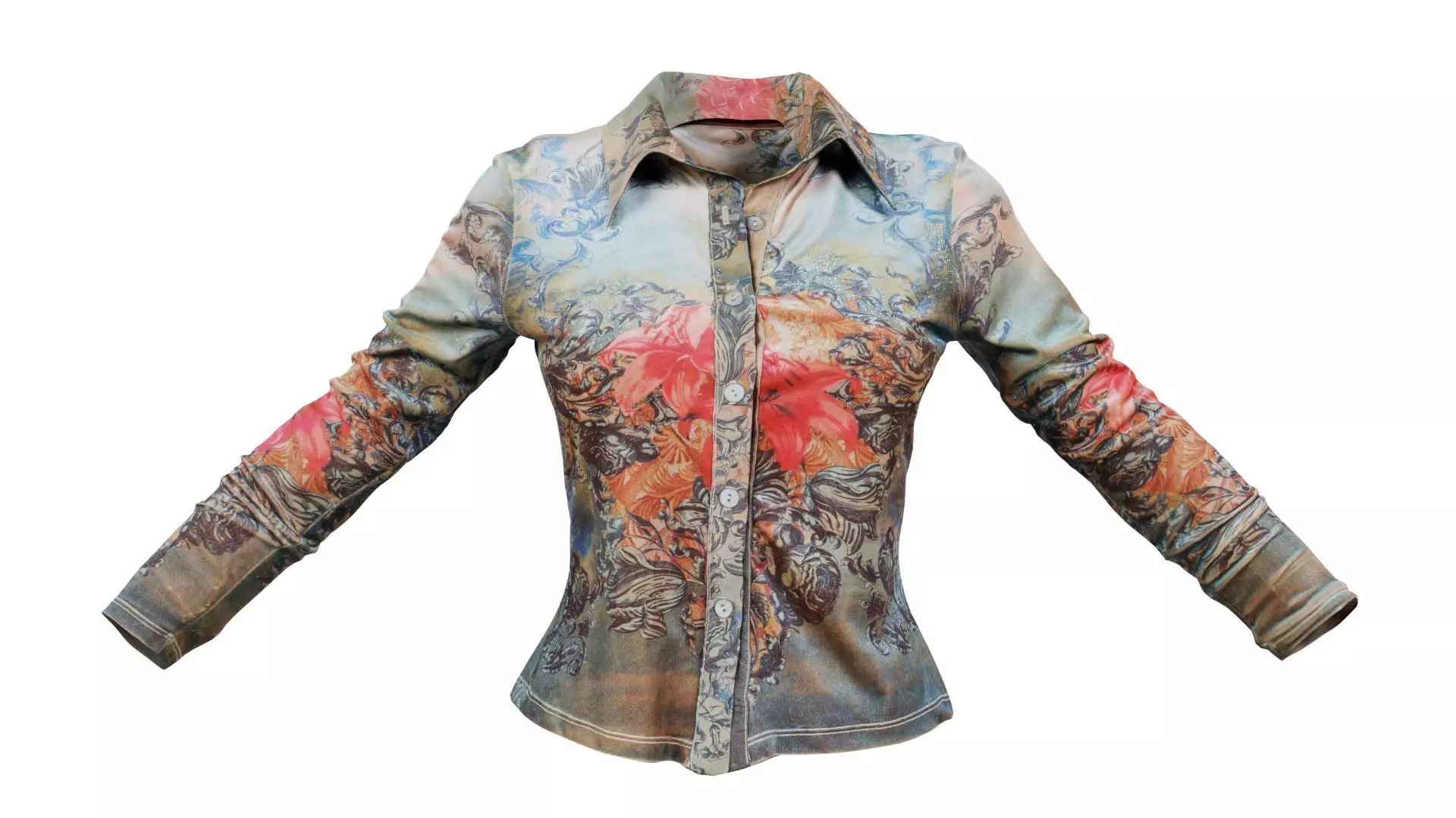 3D scanned model featuring a shirt with floral designs on it. This model, romeo top, has been created using photogrammetry from a real world object.The raw scan data has been cleaned, retopologized and UV-unwrapped using Zbrush. The result is a low poly mesh with baked maps. The .obj and .mtl are configured so that maps will load automatically in the shader (tested in Blender). In addition, a Blender scene is provided with the model and shader already set up for rendering and export. Detailed information below: