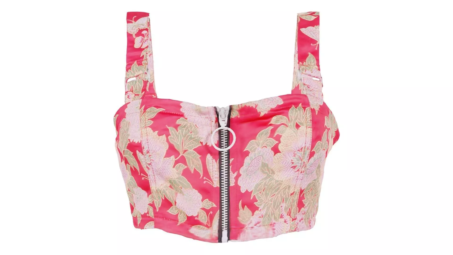 3D scanned model featuring a pink floral crop top with a zipper. This model, roses top, has been created using photogrammetry from a real world object.The raw scan data has been cleaned, retopologized and UV-unwrapped using Zbrush. The result is a low poly mesh with baked maps. The .obj and .mtl are configured so that maps will load automatically in the shader (tested in Blender). In addition, a Blender scene is provided with the model and shader already set up for rendering and export. Detailed information below: