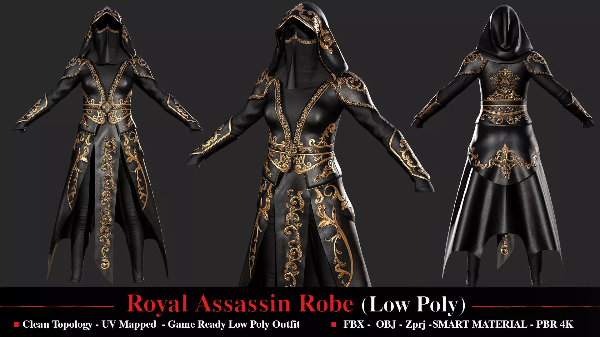 Royal Assassin Robe is a low poly, game-ready outfit, designed with a stealthy royal aesthetic. The garment was created over the Camila base character (CC4) using Marvelous Designer.