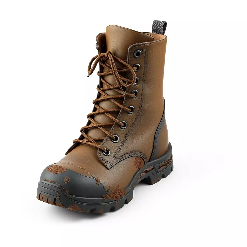 This is a meticulously crafted 3D model of a rugged brown leather work or combat boot, designed for exceptional realism and versatility. The model features intricate details such as authentic stitching, robust laces, and a durable black rubber sole with an integrated toe cap, showcasing a strong, utilitarian aesthetic. It comes complete with realistic dirt and subtle wear textures, perfectly simulating a well-used and weathered appearance that adds significant character and authenticity to any scene. This high-quality asset is ideal for a broad spectrum of applications, including enhancing character outfits in video game development, populating detailed architectural visualization projects, or creating immersive augmented reality (AR) and virtual reality (VR) environments. Its optimized, clean topology ensures smooth performance in real-time applications while maintaining high visual fidelity for stunning static renders and cinematic productions. The boot is fully UV unwrapped and includes professionally crafted PBR (Physically Based Rendering) textures, allowing for seamless and realistic material rendering across various 3D engines and software. It is ready for easy integration into your projects and supports widely used 3D formats such as GLB, OBJ, STL, ABC, DAE, FBX, and USD. Whether you are building a post-apocalyptic world, an industrial workshop, an outdoor adventure scene, or any scenario requiring durable footwear, this model will elevate your visual storytelling.