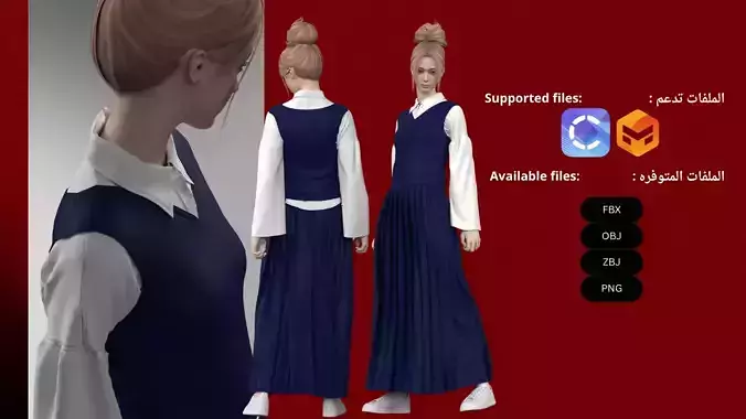 مثالي للمصممين، طلاب الأزياء، ومشاريع المحاكاة الواقعيةA realistic Saudi high school girls’ uniform, designed in high-quality 3D with accurate details and elegant modest styling.The outfit features a white blouse with wide sleeves and a navy pleated long skirt, perfect for fashion design projects, virtual fitting, or real-world garment production.Fully compatible with CLO3D and Marvelous Designer, and available in multiple file formats for maximum flexibility: