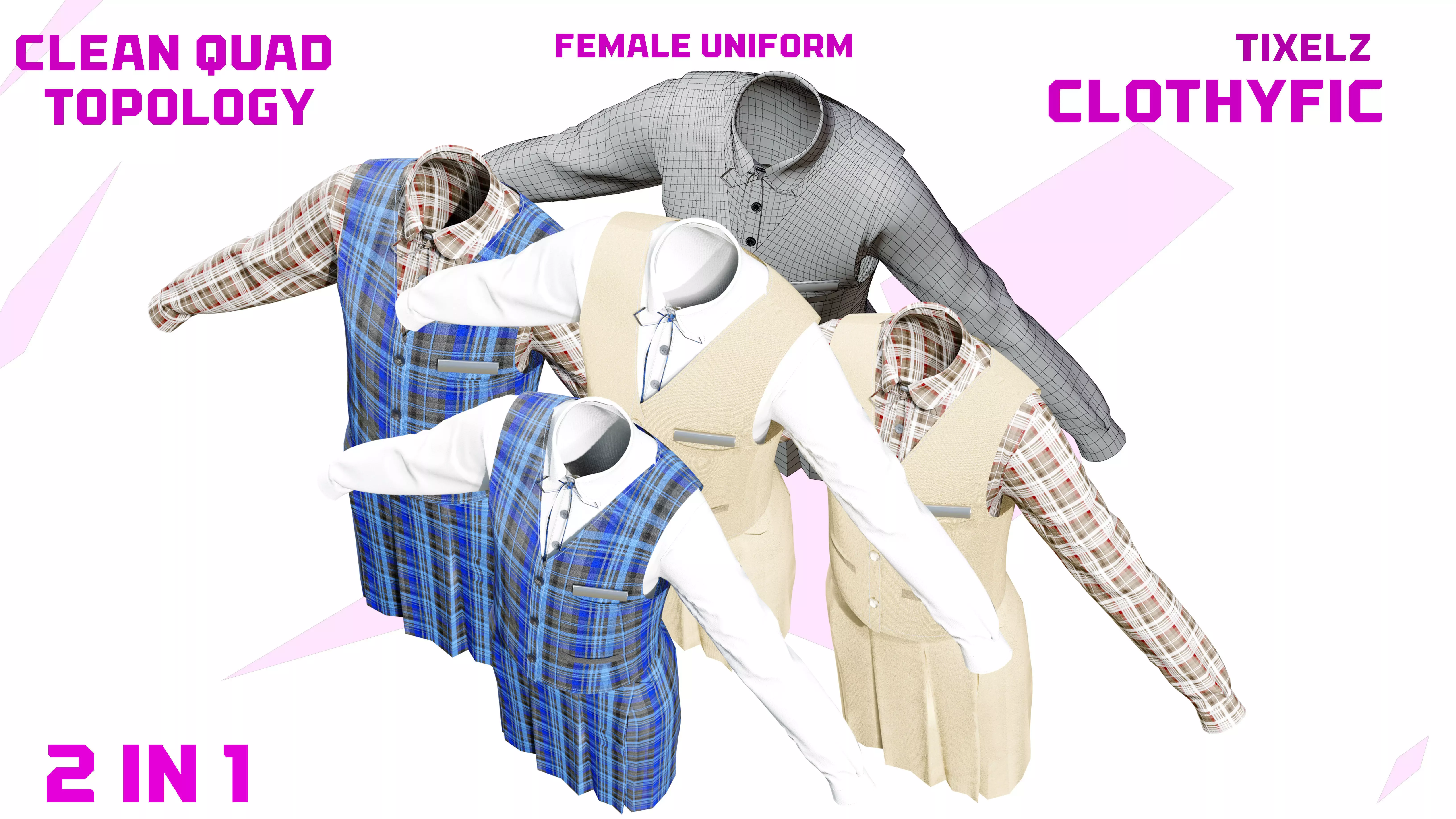 This 3D clothing model features a female school uniform outfit, complete with a long-sleeve shirt, pleated skirt, and two classic uniform style variations. Designed with clean quad topology, the model is game ready, animation ready, and optimized for PBR rendering.