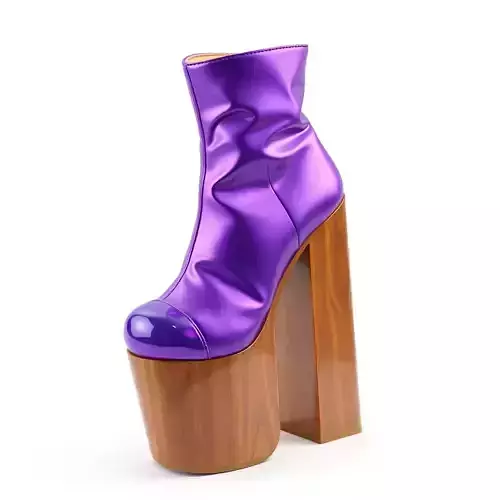 This exquisite 3D model showcases a glamorous purple platform ankle boot, meticulously designed with high fidelity for diverse digital applications. The boot features a vibrant, high-sheen purple upper, indicative of patent leather or a similar reflective material, detailed with naturalistic wrinkles and creases that enhance its realism. A defining characteristic is its towering platform and thick, robust heel, both exquisitely textured with a rich, dark wood grain, creating a captivating material contrast with the futuristic purple finish. This versatile asset is perfect for integrating into game development projects, providing a stylish footwear option for virtual characters in fashion games or digital worlds. It is equally suitable for architectural visualization, adding a chic element to interior scenes, or for augmenting virtual fashion experiences in augmented reality (AR) and virtual reality (VR) applications. Digital artists will find it invaluable for character design, product visualization, or conceptual renders. The model is built with clean, optimized topology, ensuring smooth subdivision for close-up renders and efficient performance in real-time engines. It is fully UV unwrapped, facilitating easy texture adjustments, and comes with PBR textures to achieve stunningly realistic material responses under any lighting condition. This asset is ready for immediate use and is expected to support a wide array of common formats including GLB, OBJ, STL, ABC, DAE, FBX, USD, and PLY, ensuring maximum compatibility across various 3D software and platforms.