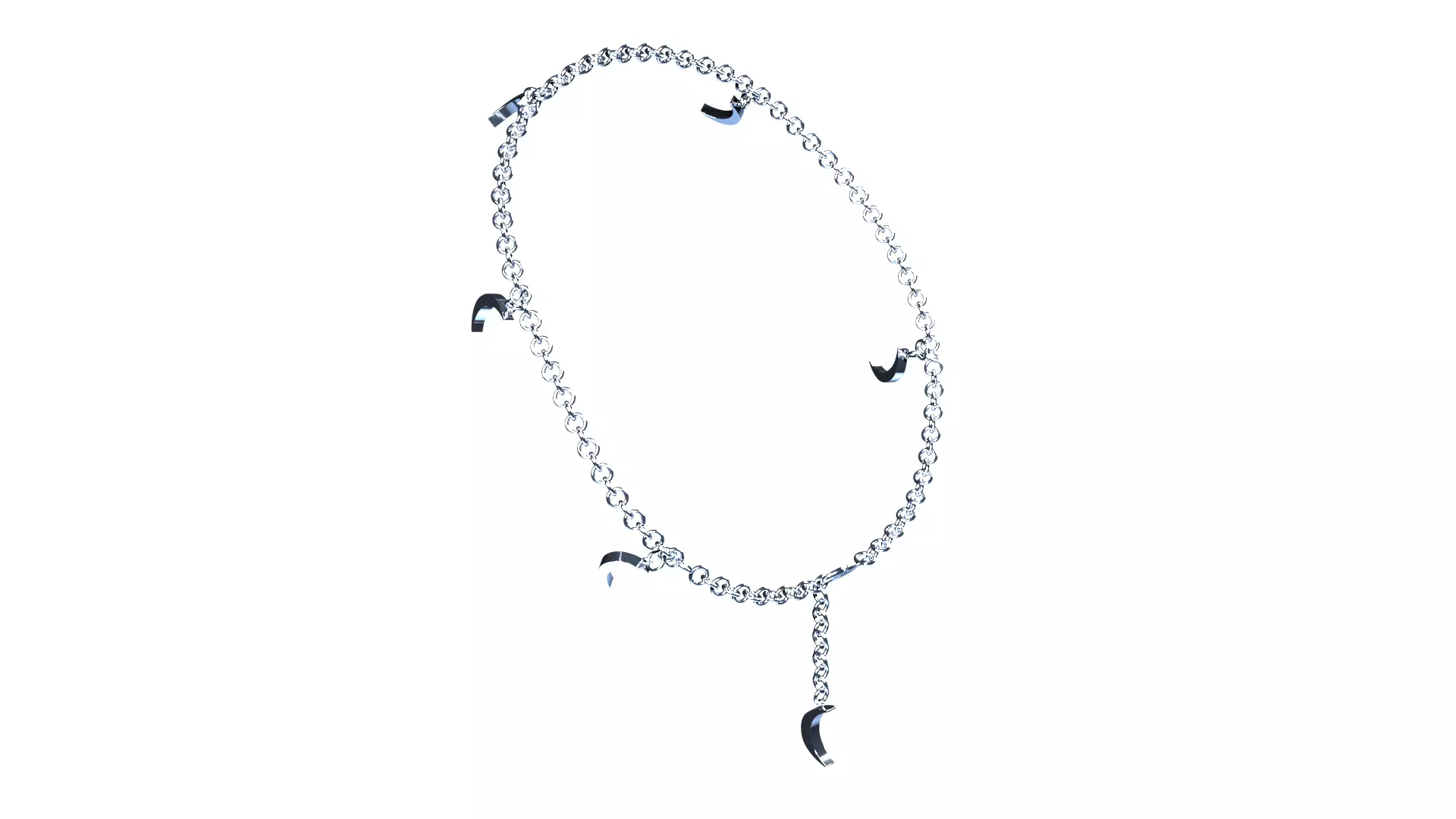 3D model of Silver Moon Sickle Charm Bracelet for women. There is a silver chain with 7 silver moon sickles in the bracelet. There is a locking mechanism in the back and the chains are rounded. Mannequin hand comes with the model.