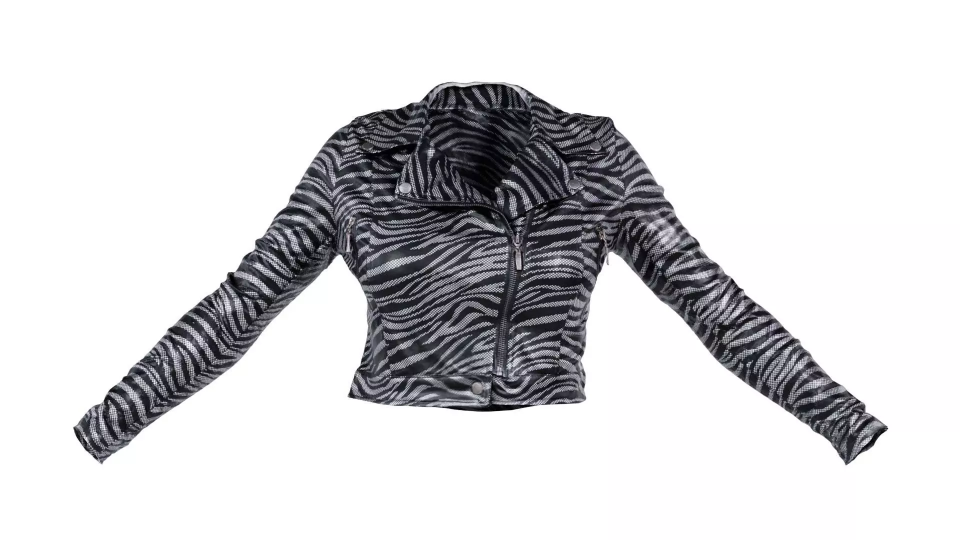 3D scanned model featuring a zebra print jacket with zippers on the sleeves. This model, silver zebra jacket, has been created using photogrammetry from a real world object.The raw scan data has been cleaned, retopologized and UV-unwrapped using Zbrush. The result is a low poly mesh with baked maps. The .obj and .mtl are configured so that maps will load automatically in the shader (tested in Blender). In addition, a Blender scene is provided with the model and shader already set up for rendering and export. Detailed information below: