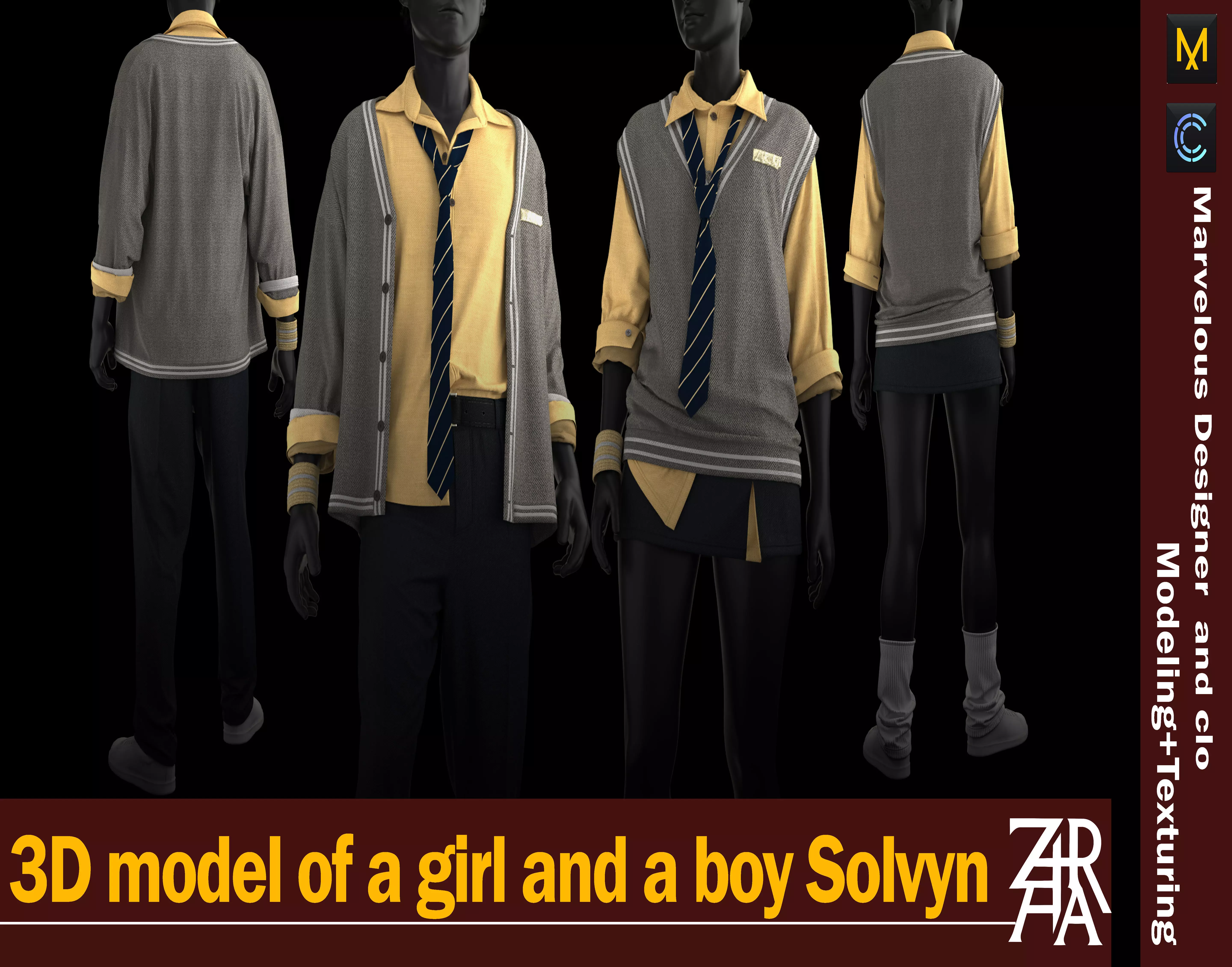 Description:Solvyn is a modern unisex college style uniform set designed with a clean, stylish and realistic structure. The outfit combines contemporary fashion with classic college elements, making it ideal for fashion visualization, character design, animation and 3D rendering projects.Each outfit is crafted with meticulous attention to fabric behavior, stitching details and natural pleats to achieve a sleek and professional look. The design is versatile and easily customizable for different styles and colors.