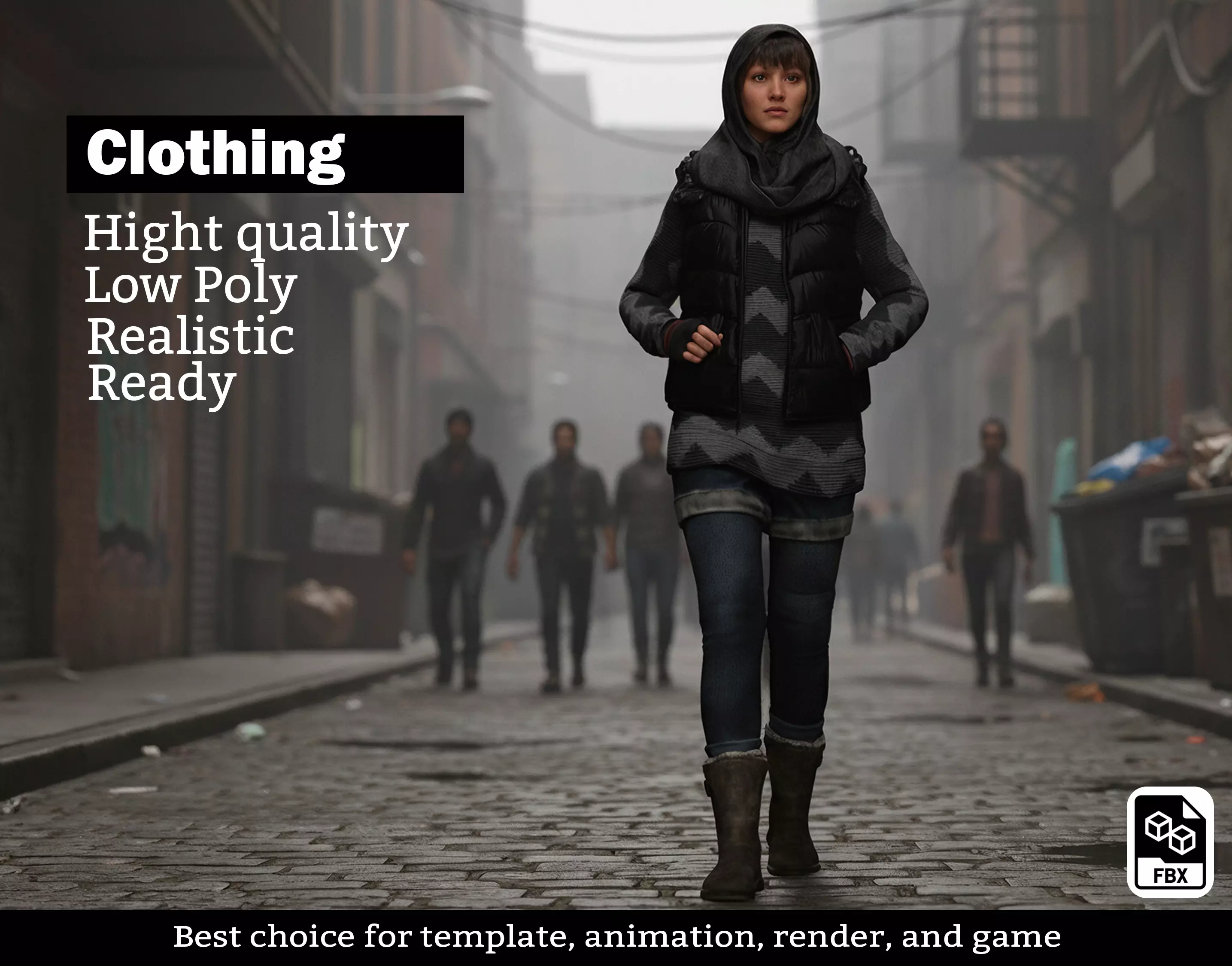 Create compelling modern or post-apocalyptic characters with this Urban Winter Clothing Set. Featuring a detailed layered look, this model combines high-fashion streetwear with rugged functionality, making it perfect for survival games, modern RPGs, or architectural visualizations.