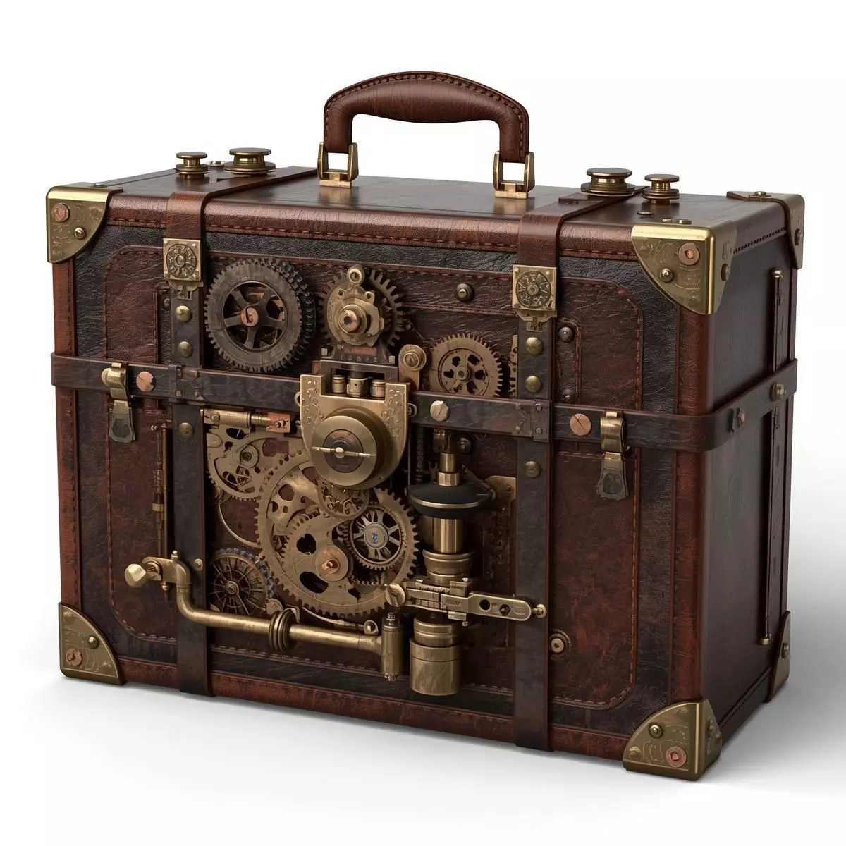 Tagssteampunk, suitcase, trunk, tool case, briefcase, victorian, industrial, gears, leather, brass, 3d model, prop, game asset, mechanical, detailed