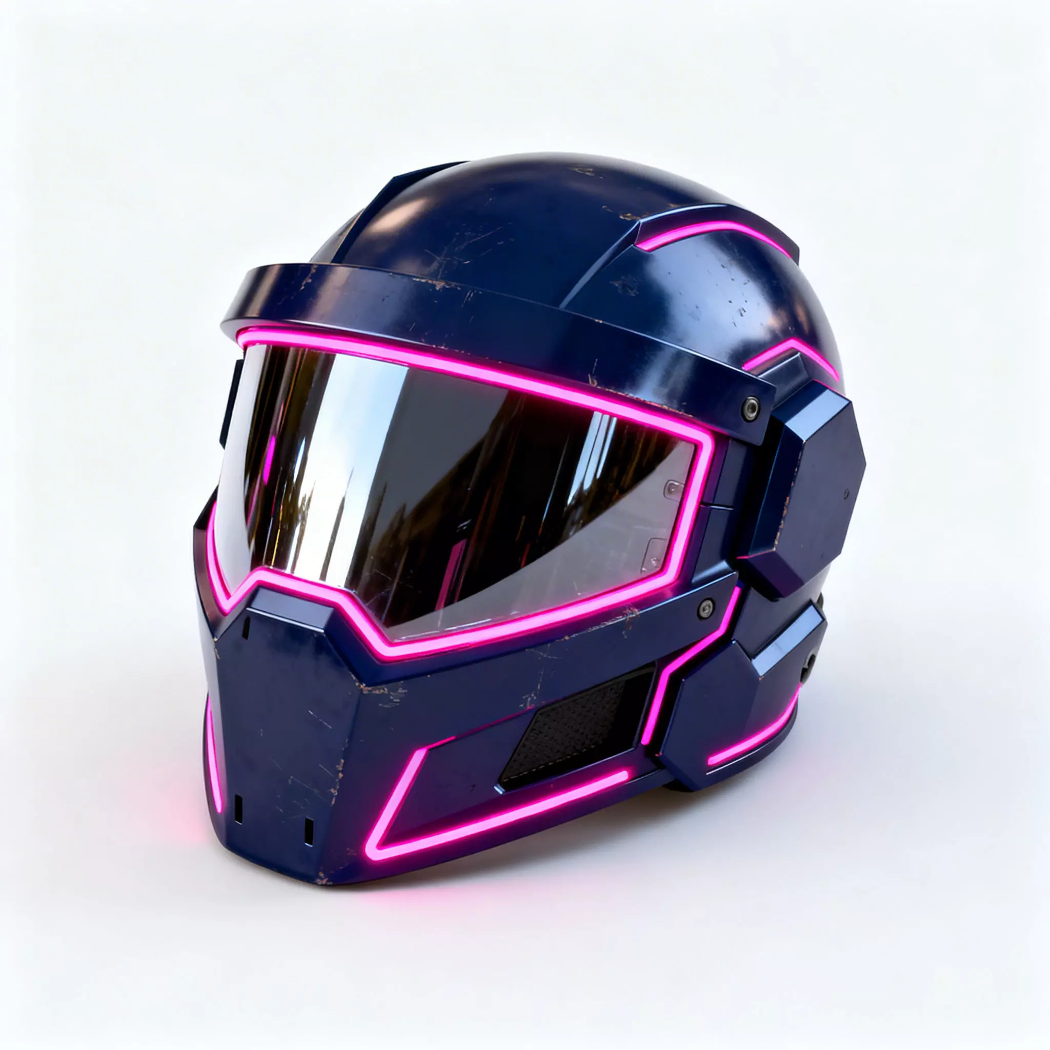 Luminous Neon-Pink AccentsA primary feature of this model is the integrated glowing neon-pink energy lines that trace the visor frame and lower jawline. Following a specialized design language, these luminous elements are modeled as solid, opaque geometry to maintain a consistent illustrative look while providing a sharp visual contrast against the dark body.
