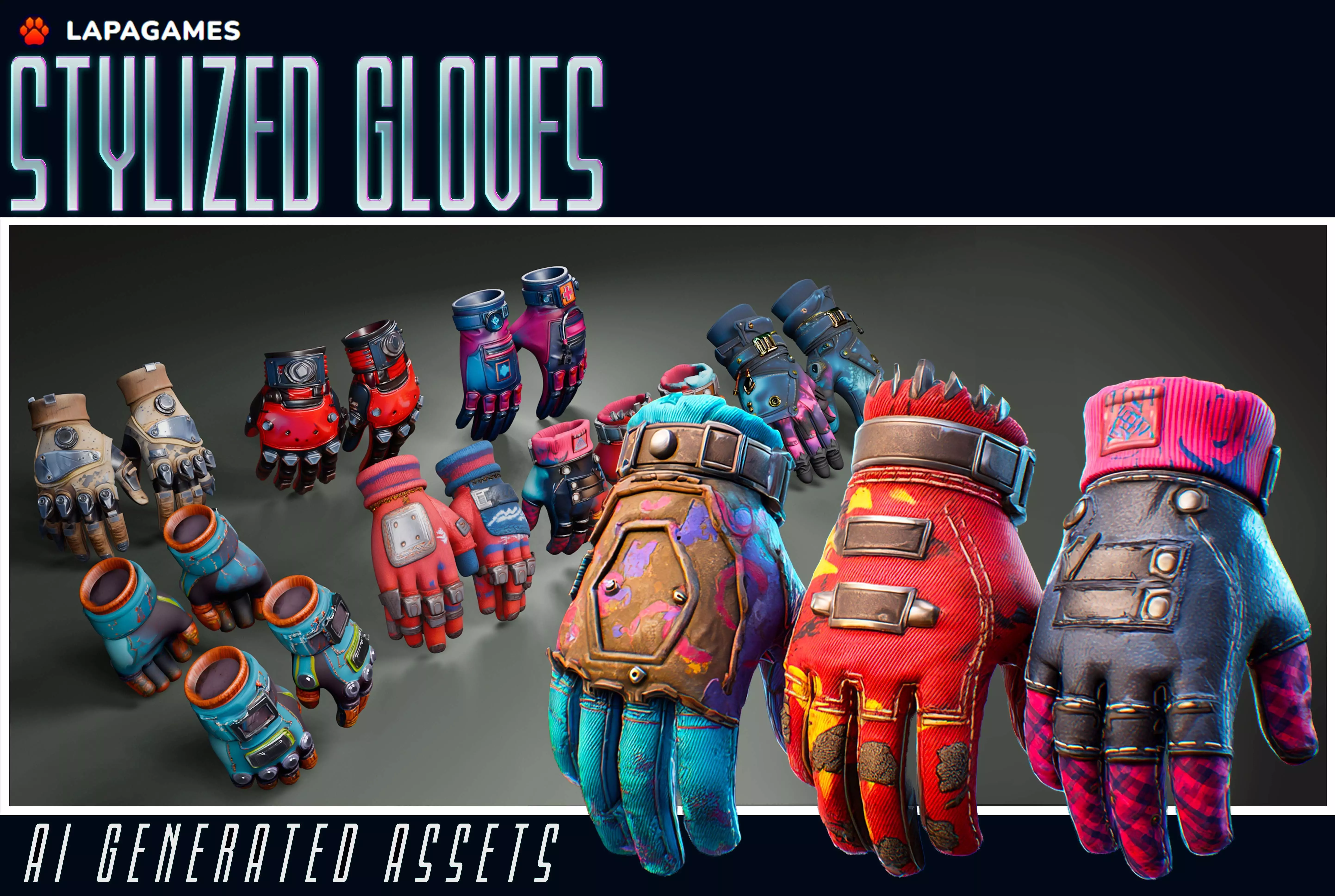 A collection of stylized, game-ready gloves perfect for first-person shooters, third-person games, sci-fi projects, RPGs, survival titles, and character customization systems.Each glove has a unique design, materials, colors, and wear details — making them suitable for heroes, enemies, NPCs, or modular equipment systems.