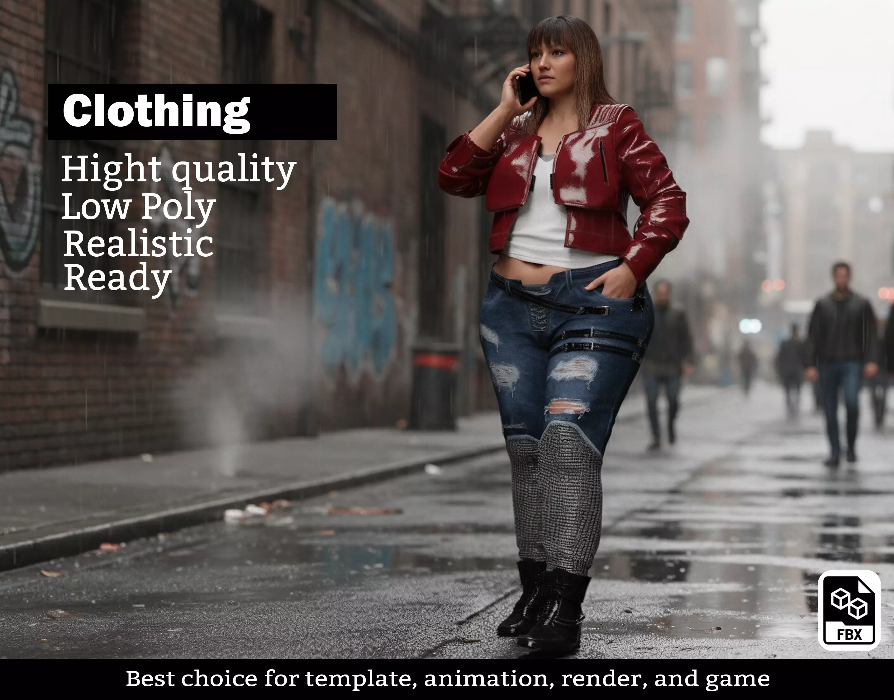 Unique Design: Combines street fashion with tactical elements like thigh straps and metallic shin guards.Material Variety: expertly textured leather, denim, cotton, and metal mesh materials.Game Ready: Low poly topology designed for seamless character animation and rigging.