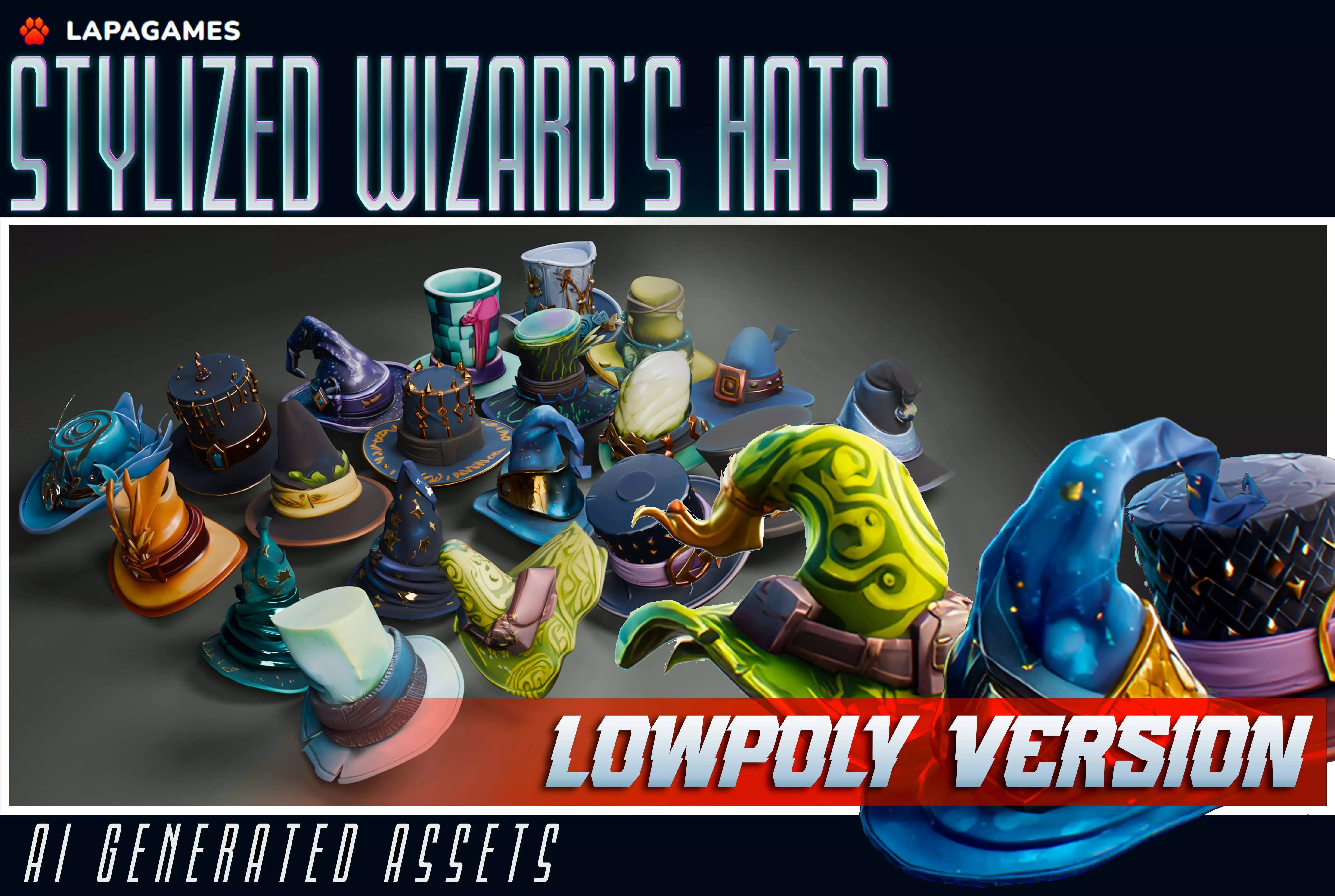 A collection of stylized lowpoly wizard hats designed for fantasy and stylized game projects.Perfect for mages, wizards, NPCs, magical shops, loot items, or decorative props.