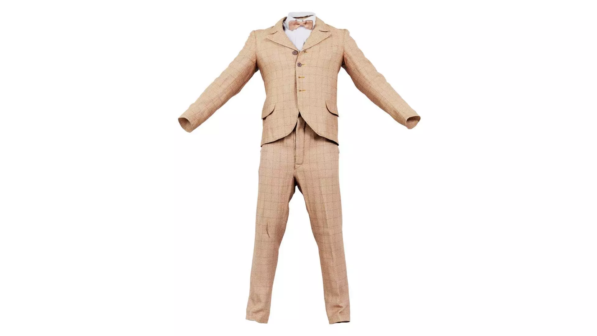 3D scanned model featuring a tan suit with a bow tie and a tie. This model, suit h closed, has been created using photogrammetry from a real world object.The raw scan data has been cleaned, retopologized and UV-unwrapped using Zbrush. The result is a low poly mesh with baked maps. The .obj and .mtl are configured so that maps will load automatically in the shader (tested in Blender). In addition, a Blender scene is provided with the model and shader already set up for rendering and export. Detailed information below:
