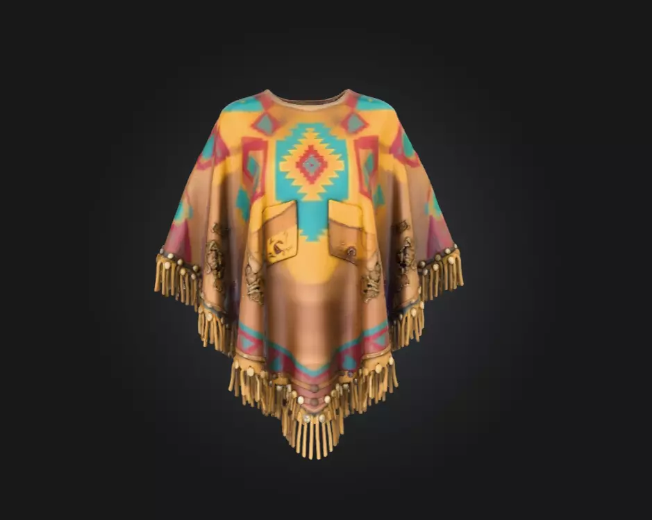 The smooth, cloth-like material folds naturally and drapes realistically, making it ideal for game characters, cinematic costumes, cultural assets, stylized NPC designs, or decorative elements in themed environments. Whether worn by a wandering traveler, a desert guardian, or a tribal chieftain, the Sunburst Nomad Poncho stands as a vibrant symbol of heritage, identity, and storytelling through fabric.