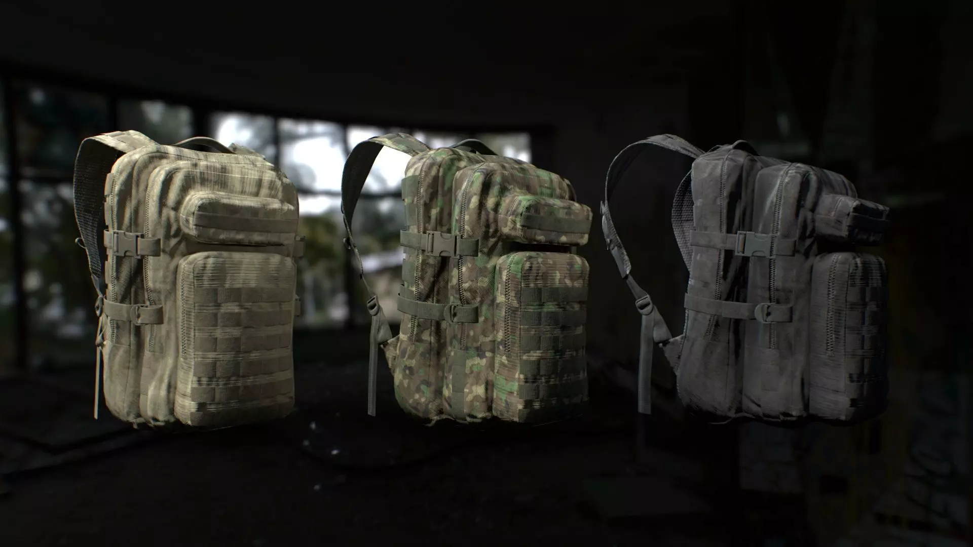 Tactical backpack in 3 colors: beige, black and camo.