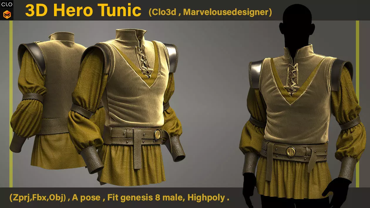 A fantasy-inspired medieval tunic designed in CLO3D, featuring intricate fabric folds, leather armor accents, and a noble silhouette. Perfect for royal guards, RPG characters, or period fashion simulation.This product made in Clo3d /Marvelouse designer with genesis 8 ,male from daz studio .