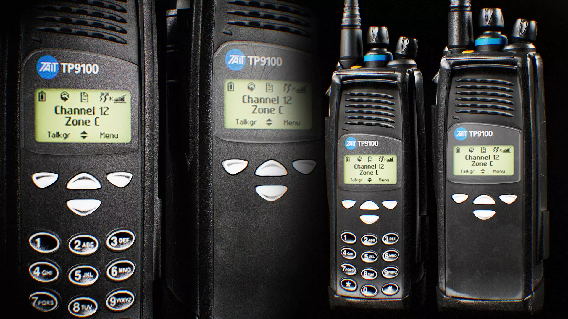 High fidelity: Accurate recreation of Tait TP9100 shape, labels, knobs, speaker grills, antenna, belt clip.